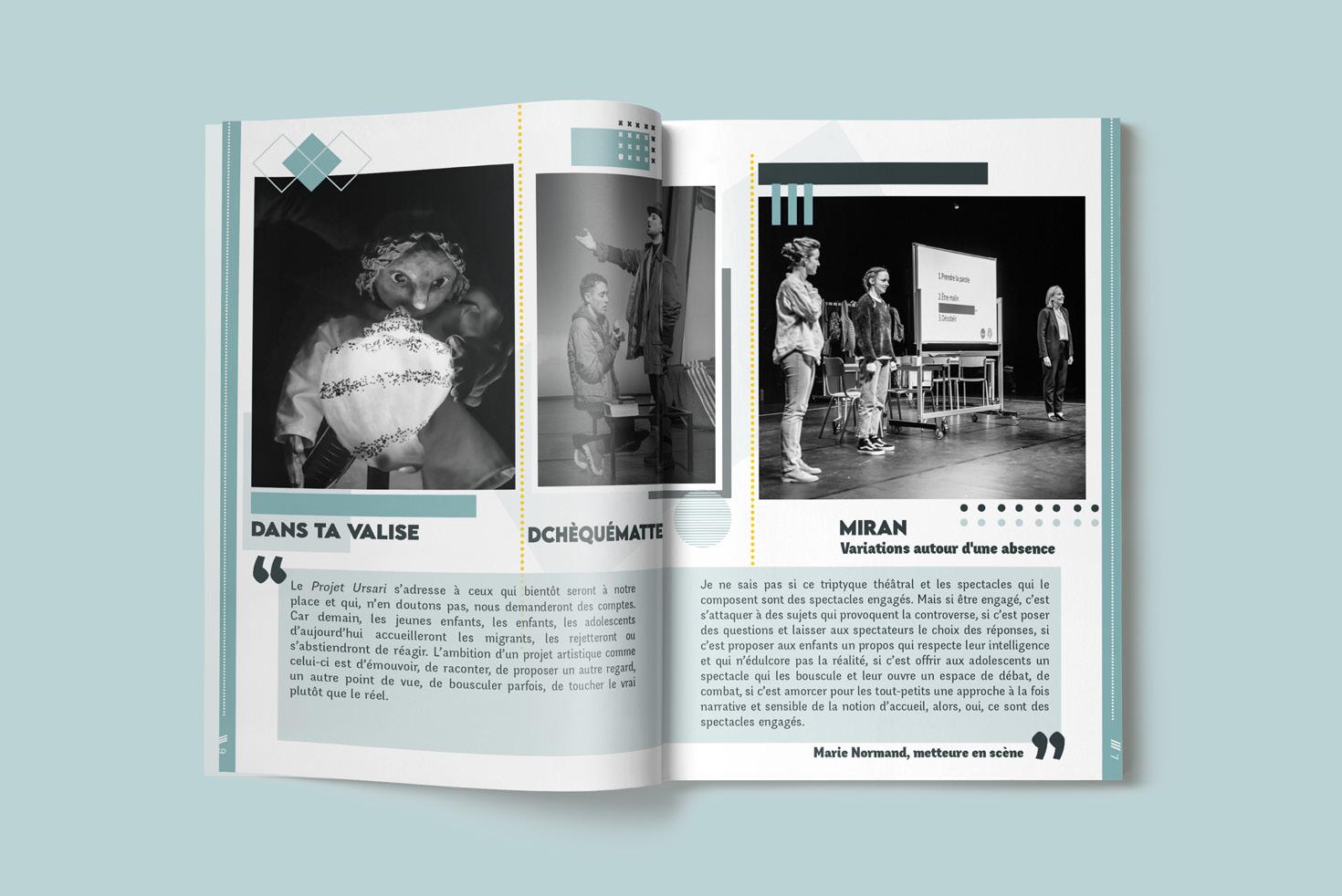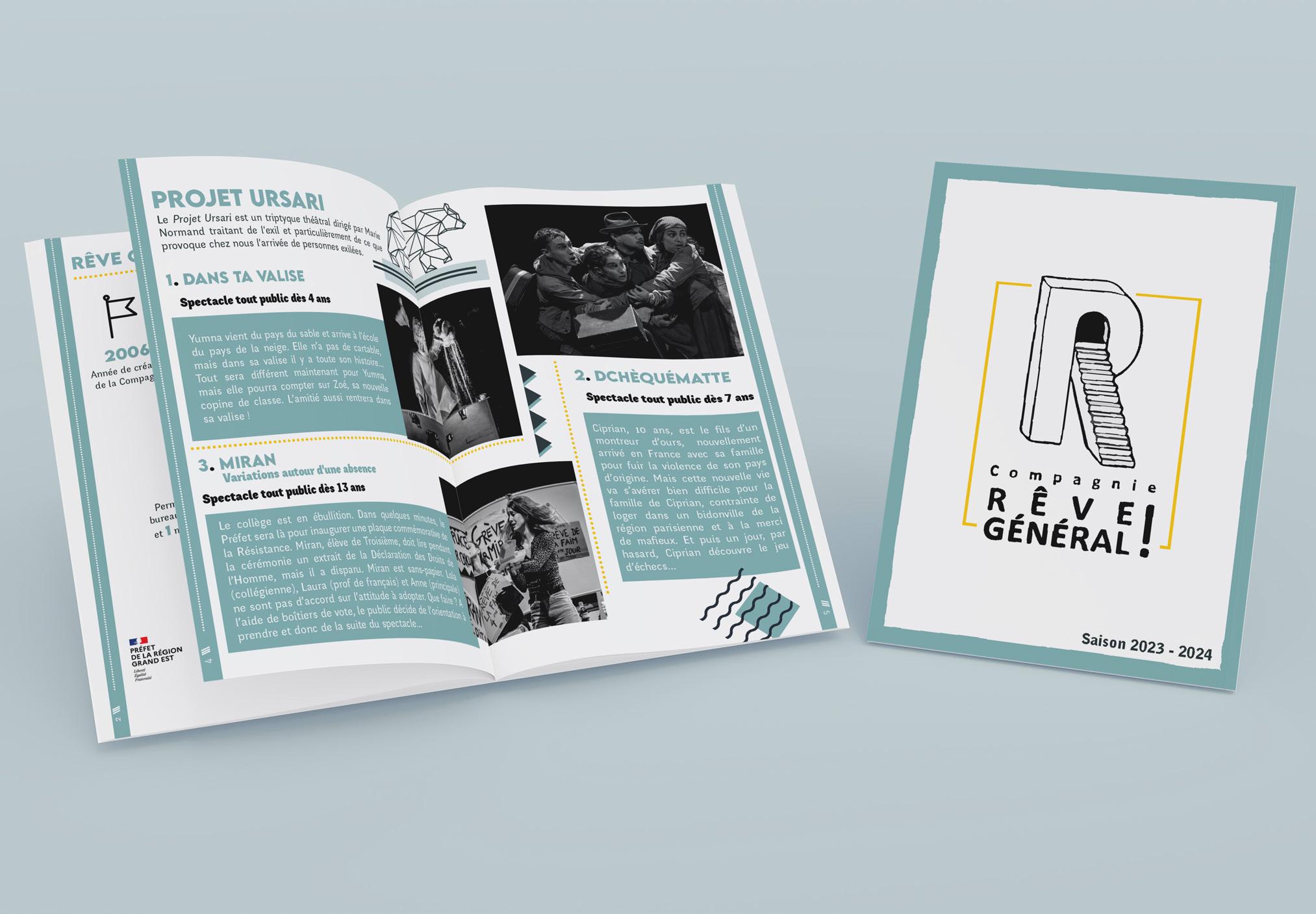 Dans le cadre du festival dâAvignon, prĂ©sentant ses diffĂ©rentes piĂšces de théùtres, la Compagnie RĂȘve gĂ©nĂ©ral ! avait besoin dâune brochure de prĂ©sentation facilement distribuable et avec un format de poche. Jâai donc proposĂ© un format A6 fermĂ© de 32 pages.