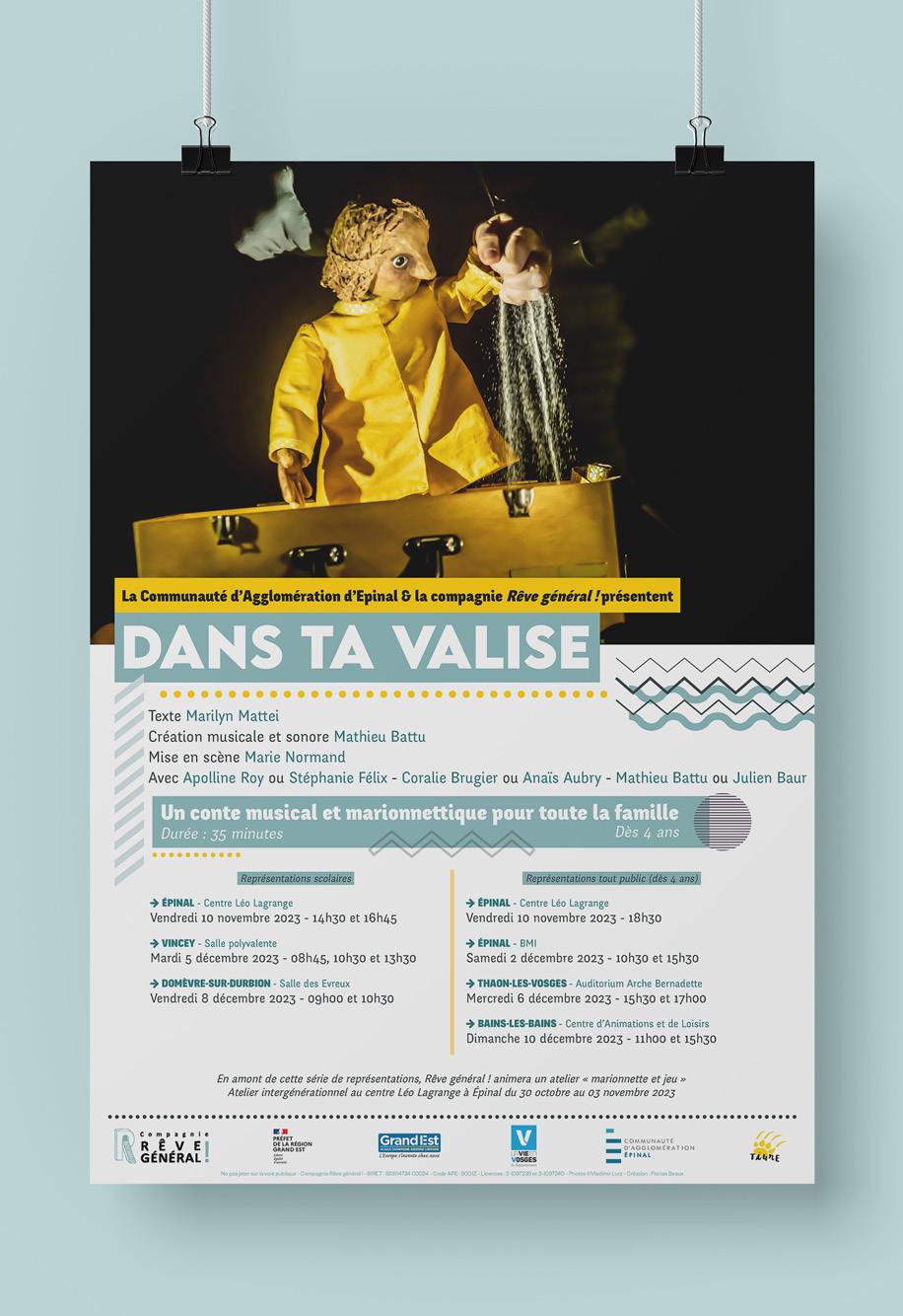 Pour Dans ta valise, jâai jouĂ© sur le titre et jâai donc misĂ© sur la forme dâune Ă©tiquette de bagage afin de communiquer les diffĂ©rentes informations sur la piĂšce. Jây ai Ă©galement ajoutĂ© un petit objet de communication qui prend la forme dâune valise avec les informations principales.