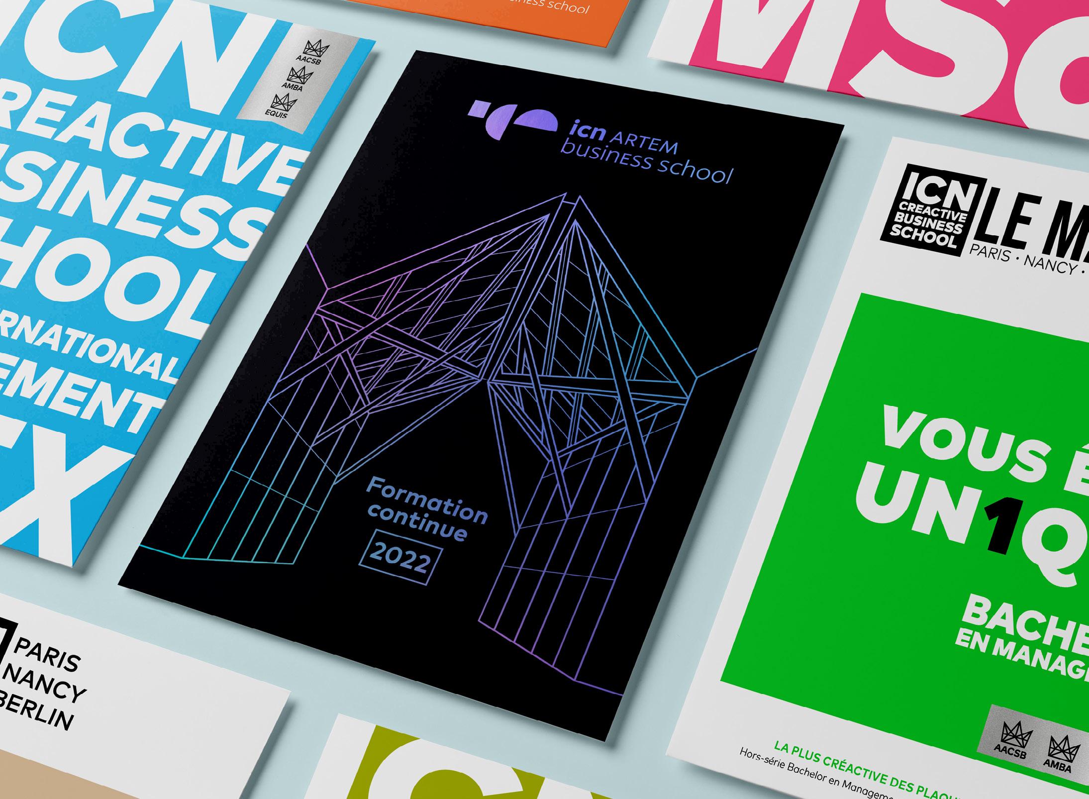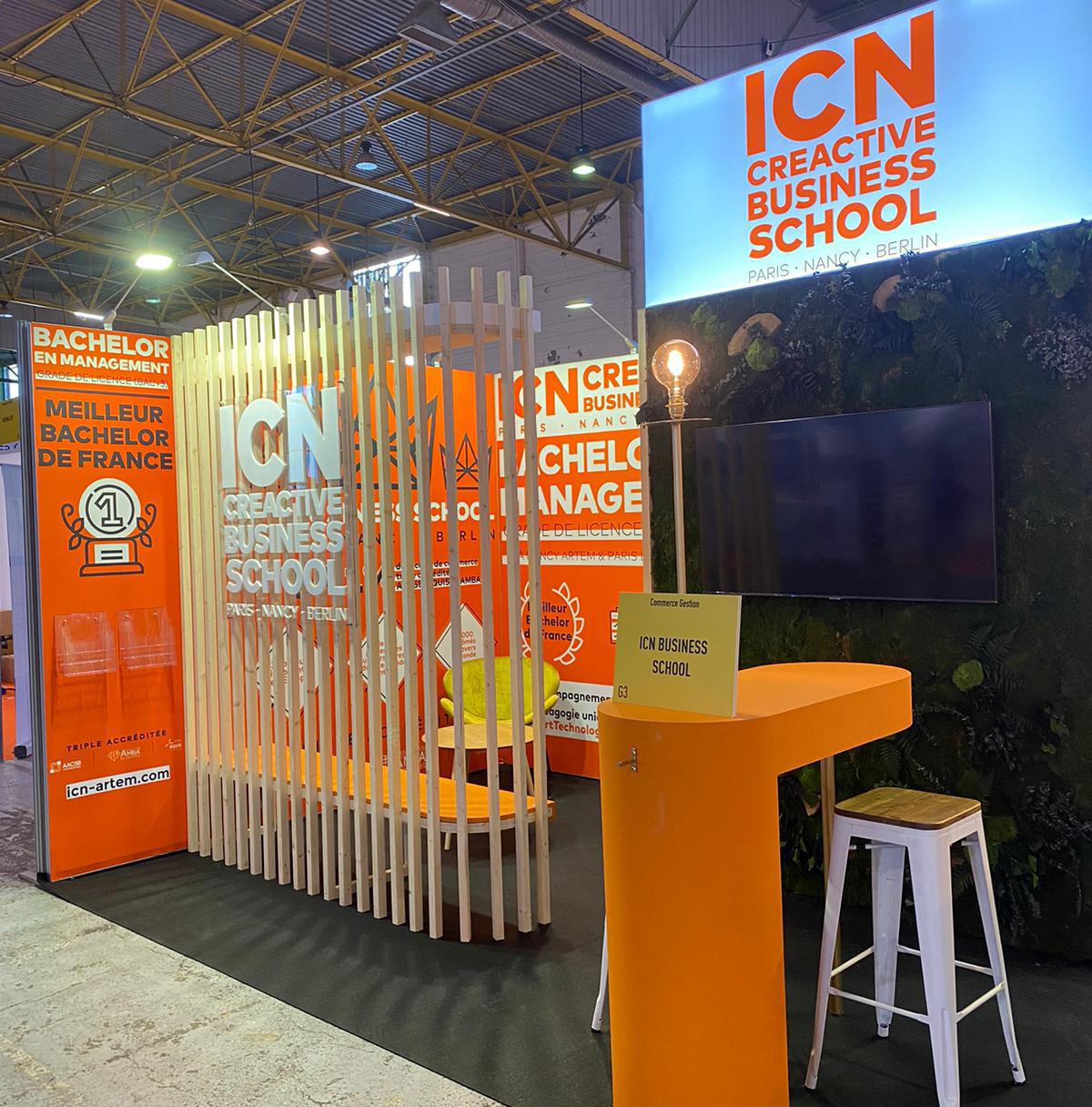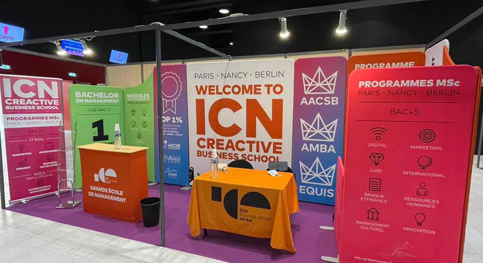 Toujours en collaboration avec lâĂ©cole de management ICN Business School, jâai créé plusieurs supports dâaffichages et de PLV pour des stands dâinformations et des salons dâorientation.