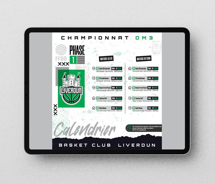 Puis aprĂšs avoir adoptĂ© un nouveau logo, le Basket Club Liverdun avait besoin de nouvelles tenues de matchs avec la nouvelle identitĂ© graphique. Câest pourquoi jâai créé les nouveaux maillots de matchs des diifĂ©rentes Ă©quipes du club.