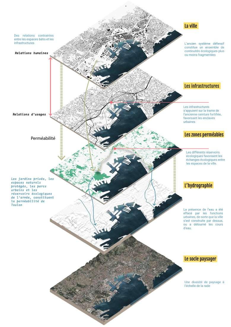 Je me suis principalement intéressé à l’ancienne ceinture fortifiée de Toulon qui présente des potentialités pour répondre aux enjeux actuels et à venir du territoire. L’ancien système défensif dessine un parcours, qui intègre plusieurs morceaux de remparts, qui marquent cependant une limite physique et psychologique entre la ville ancienne et la ville moderne. Ce parcours peut constituer la base d’une réponse spatiale à la problématique : frange littorale urbanisée et grands espaces militarisés : comment l’empreinte des remparts peut-elle atténuer la limite entre ville moderne et processus de métropolisation? Ma réflexion aboutira à une prise en compte de ce site aussi bien à l’échelle globale qu’à l’échelle du quartier.
