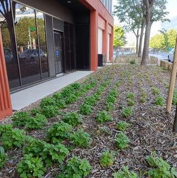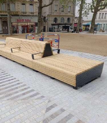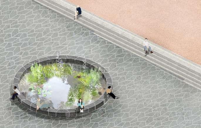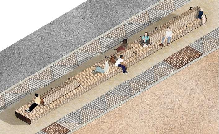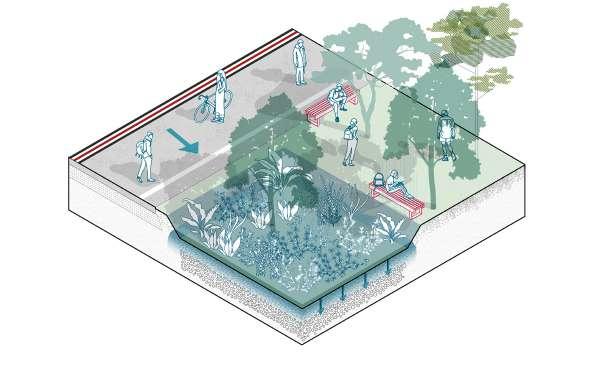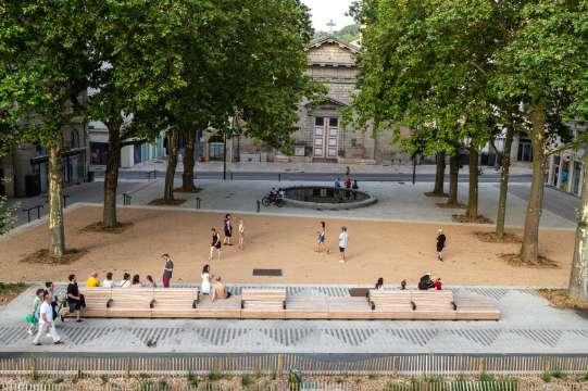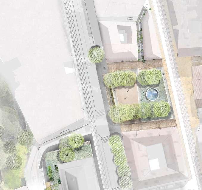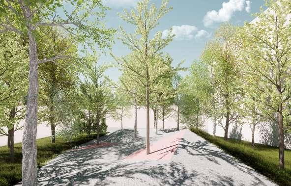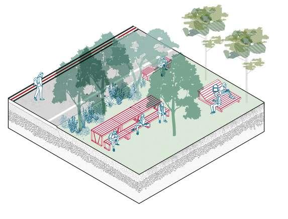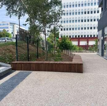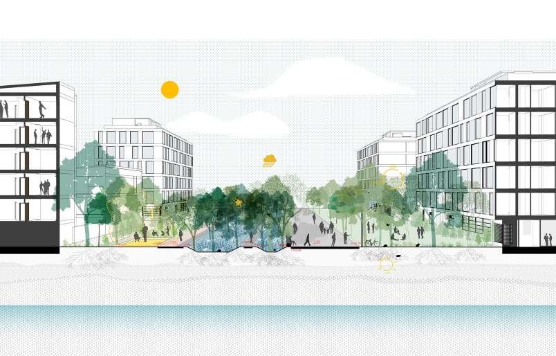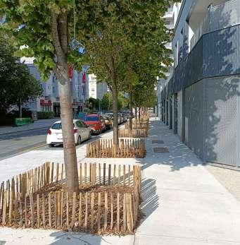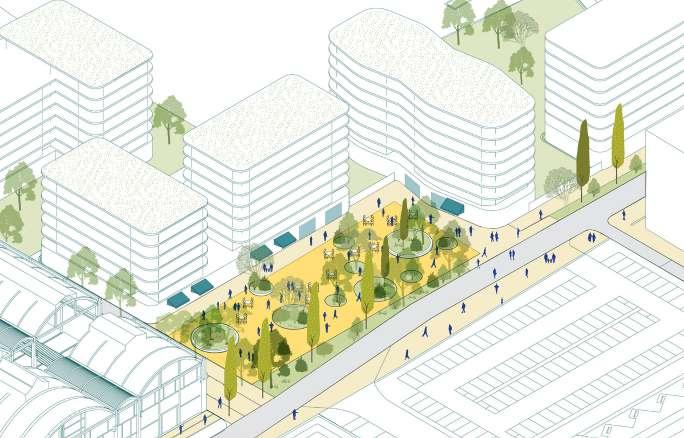 par une trame végétale structurée autour de plusieurs massifs aux formes variées. La végétation choisie permet à la fois de répondre aux enjeux d’ilôts de chaleur urbain, mais aussi d’offrir des espaces frais et agréables aux habitants et usagers. L’objectif a été de réduire au maximum l’imperméabilisation des sols, sans pour autant fragmenter les espaces publics.