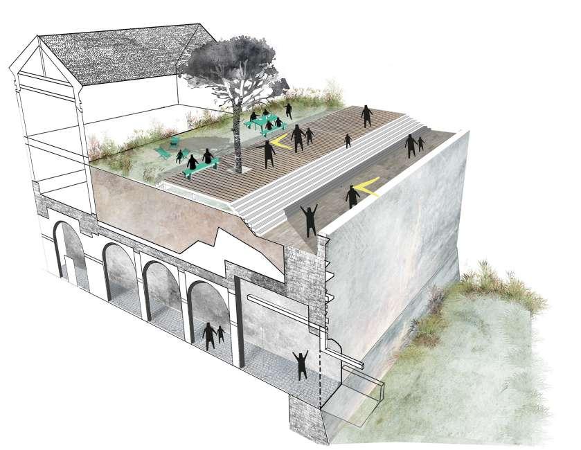 des friches dans une graineterie et tester l’acclimatation des végétaux dans des serres ou des parcelles-tests. Ensuite, le laboratoire accueille une matériauthèque qui classifie les matériaux issus de la transformation des bâtiments du Rabot (réhabilitation, réemploi, déconstruction…), pour ensuite les utiliser sur d’autres projets. Certains bâtiments seront transformés en ateliers où l’on fabrique, transforme, invente avec la pierre, le béton, le verre, le bois, etc. Cette démarche souhaite explorer de nouvelles manières de faire en s’appuyant sur les ressources existantes du site dans un objectif de cycles vertueux. Nous cherchons à adopter une démarche de projet tournée vers la sobriété, en réduisant à la fois les dépenses énergétiques liées à la transformation de la matière et la consommation en eau. Ainsi, les expérimentations menées sur la ville-montagne, testent des actions d’aménagements concrètes qui pourront alimenter le renouvellement de l’espace public de la ville-plaine.