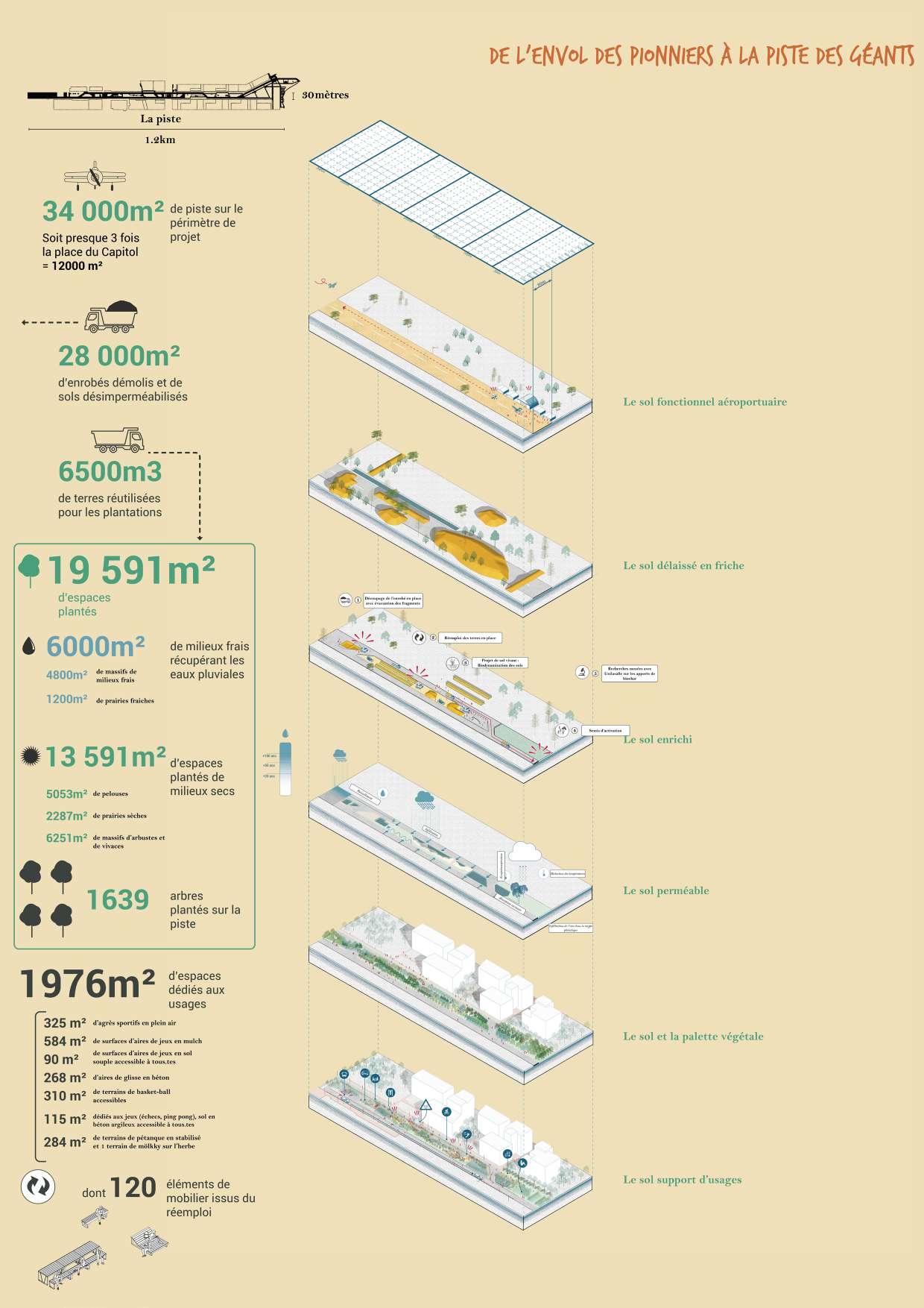 J’ai également pu travailler sur le projet de transformation de l’ancienne piste d’aéroport de Toulouse Montaudran, en un parc urbain de plusieurs hectares. Les thématiques du réemploi des terres sur place et de gestion des eaux pluviales nous ont conduits à penser le projet en plusieurs phases. Avec 19591m² d’espaces plantés et 1619 arbres ce projet apparait comme un parc urbain métropolitain.