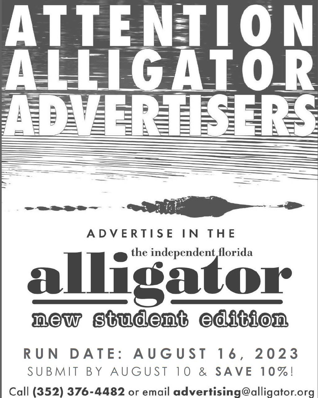 Corrections and Cancellations: Cancellations: Call 373-FIND M-F, 8am - 4pm. No refunds or credits can be given. Alligator errors: Check your ad the FIRST day it runs. Call 373-FIND with any corrections before noon. THE ALLIGATOR IS ONLY RESPONSIBLE FOR THE FIRST DAY THE AD RUNS INCORRECTLY. Corrected ads will be extended one day. No refunds or credits can be given after placing the ad. Corrections called in after the frst day will not be further compensated. Customer error or changes: Changes must be made BEFORE NOON for the next day’s paper. There will be a $2.00 charge for minor changes. Online: w/ major credit card at www.alligator.org/classifieds In Person: Cash, Check, MC, Discover, AMEX or Visa @The Alligator Offce: 2700 SW 13th St. M-F, 8am - 4pm By E-mail: classifed@alligator.org By Fax: (352) 376-4556 By Mail: P.O. Box 14257 G-ville 32604 See alligator.org for more information Call 352-373-FIND for information. Sorry, no cash by mail. Credit cards or checks only. MONDAY, JULY 31, 2023 Corrections and Cancellations: Cancellations: Call 373-FIND M-F, 8am - 4pm. No refunds or credits can be given. Alligator errors: Check your ad the FIRST day it runs. Call 373-FIND with any corrections before noon. THE ALLIGATOR IS ONLY RESPONSIBLE FOR THE FIRST DAY THE AD RUNS INCORRECTLY. Corrected ads will be extended one day. No refunds or credits can be given after placing the ad. Corrections called in after the frst day will not be further compensated. Customer error or changes: Changes must be made BEFORE NOON for