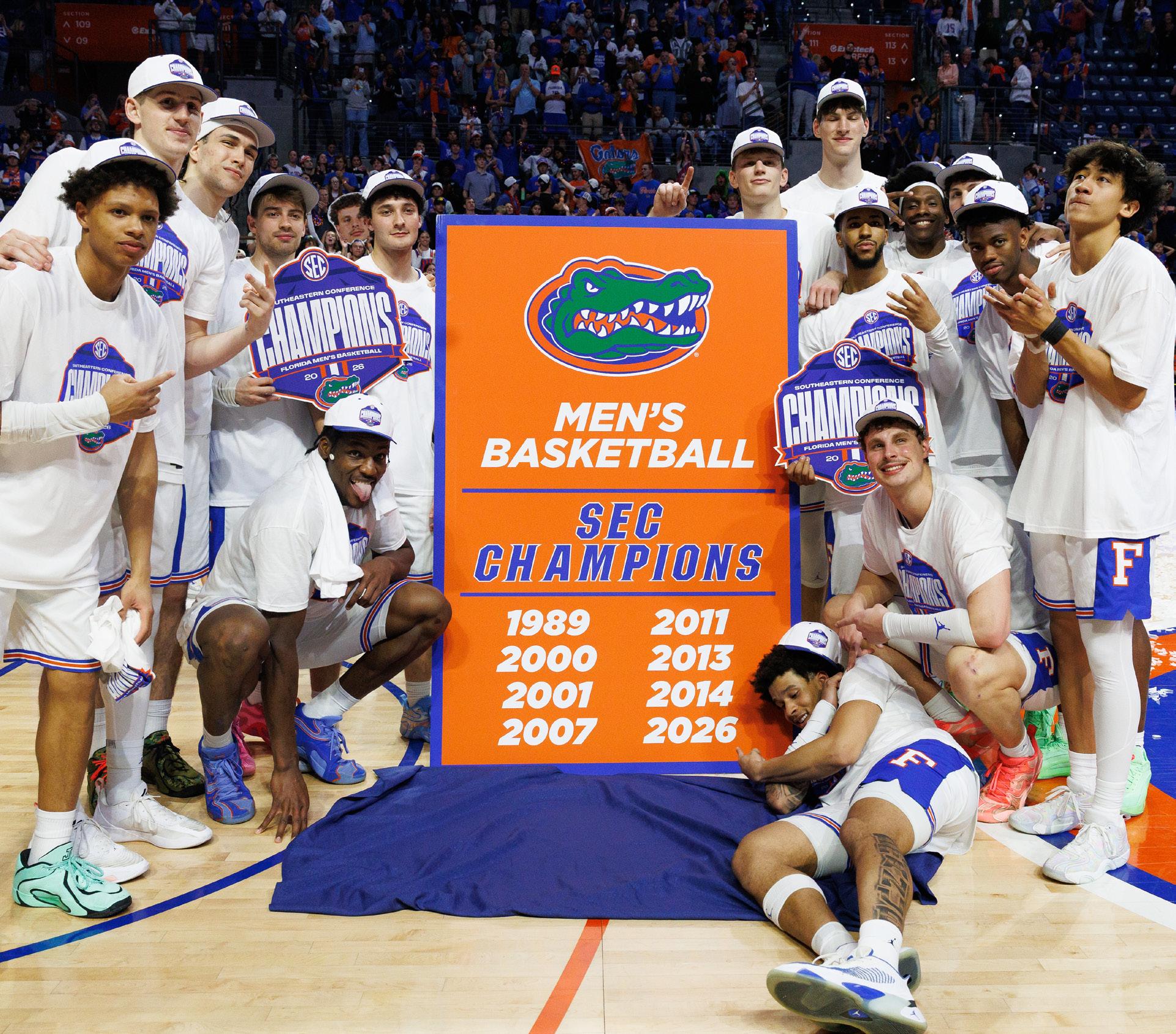 The Florida men’s basketball team poses with the SEC Championship sign after defeating Arkansas