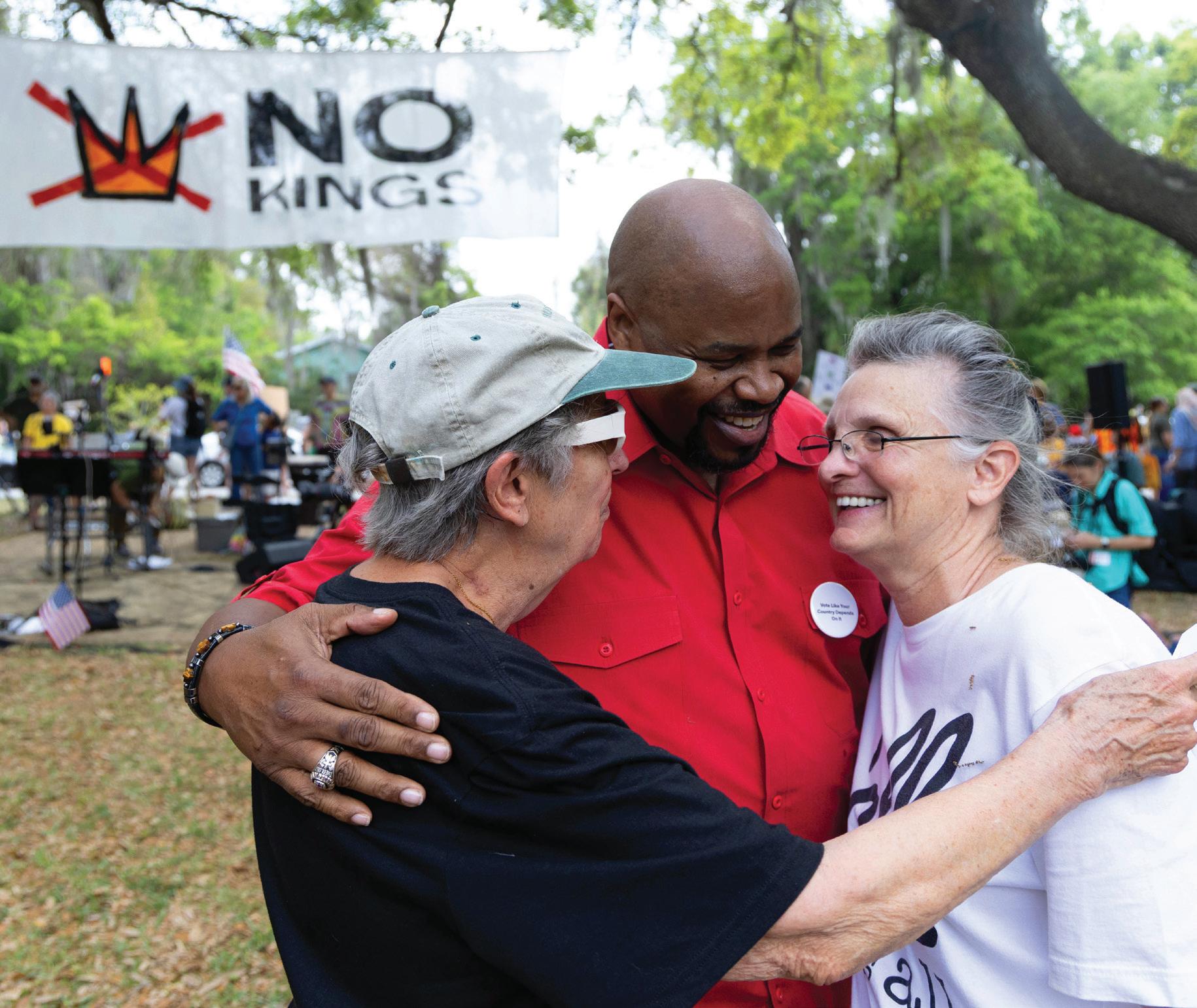Gary Neal, assistant pastor at New Beginning Christian Worship Center, embraces two attendees of a “No Kings” protest, Saturday, March 28, 2026, at Cora P. Roberson Park in Gainesville, Fla. Read more on pg. 3.