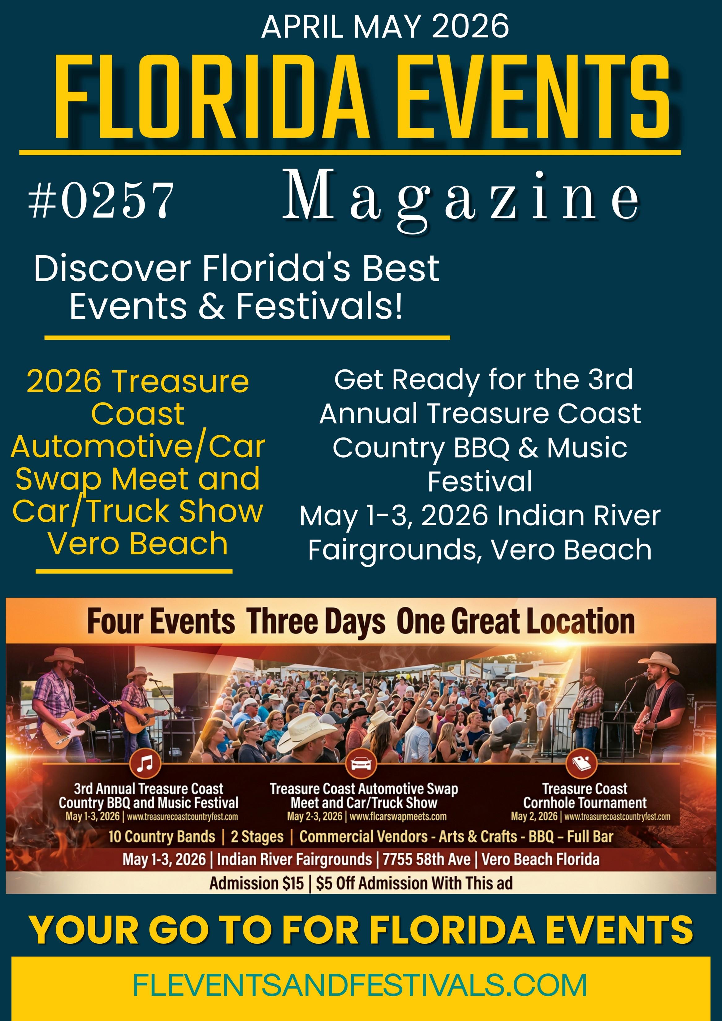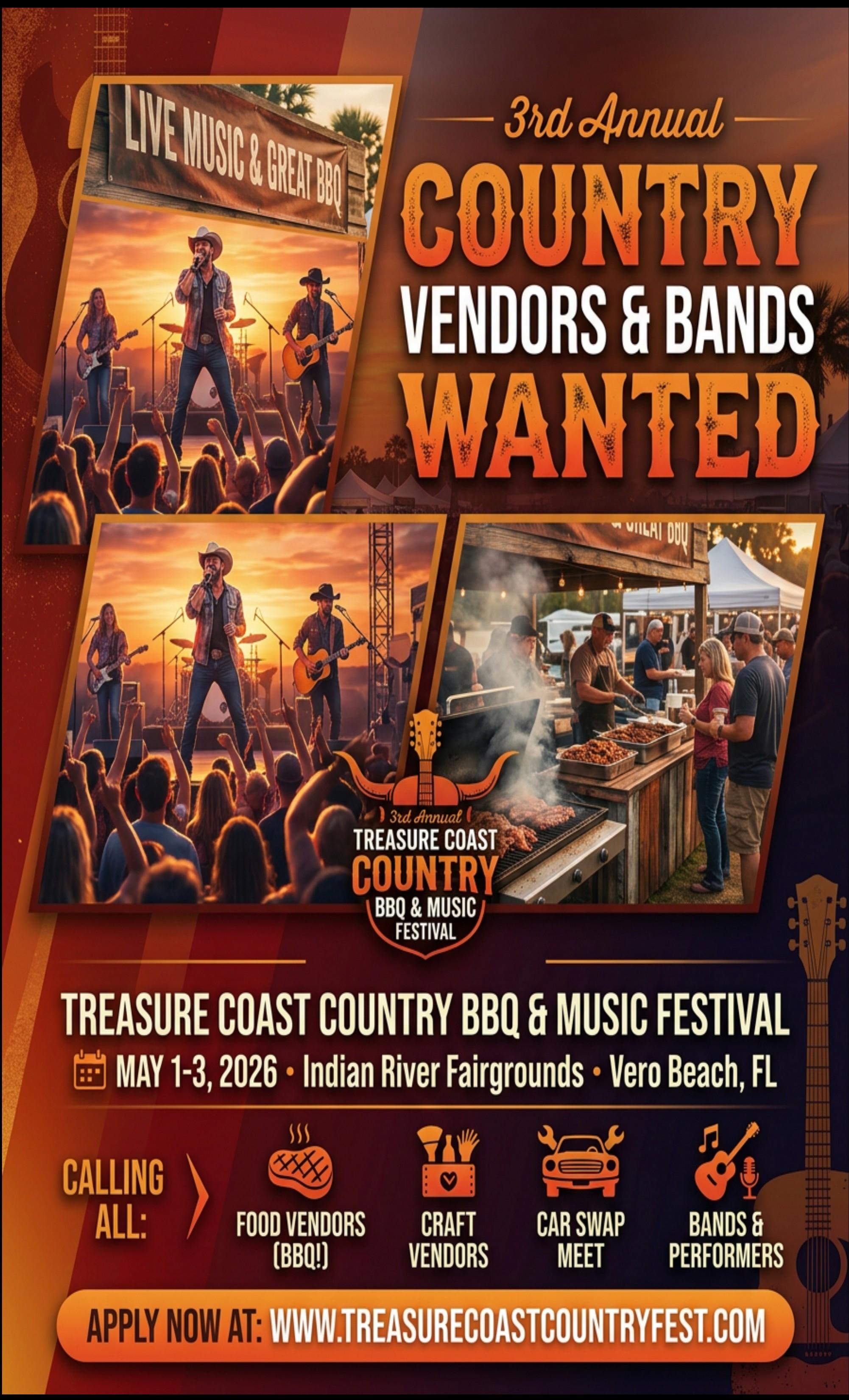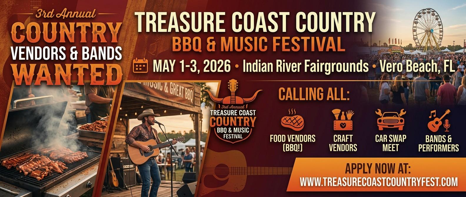 VERO BEACH, FL – The 3rd Annual Treasure Coast Country BBQ & Music Festival is back and bigger than ever! Mark your calendars for May 1-3, 2026, and join us at the Indian River Fairgrounds in Vero Beach for a weekend filled with live country music, mouthwatering barbecue, and familyfriendly fun. Applications are now open for BBQ vendors, arts & crafts exhibitors, commercial vendors, and country bands to be part of this exciting celebration of music, food, and community spirit.