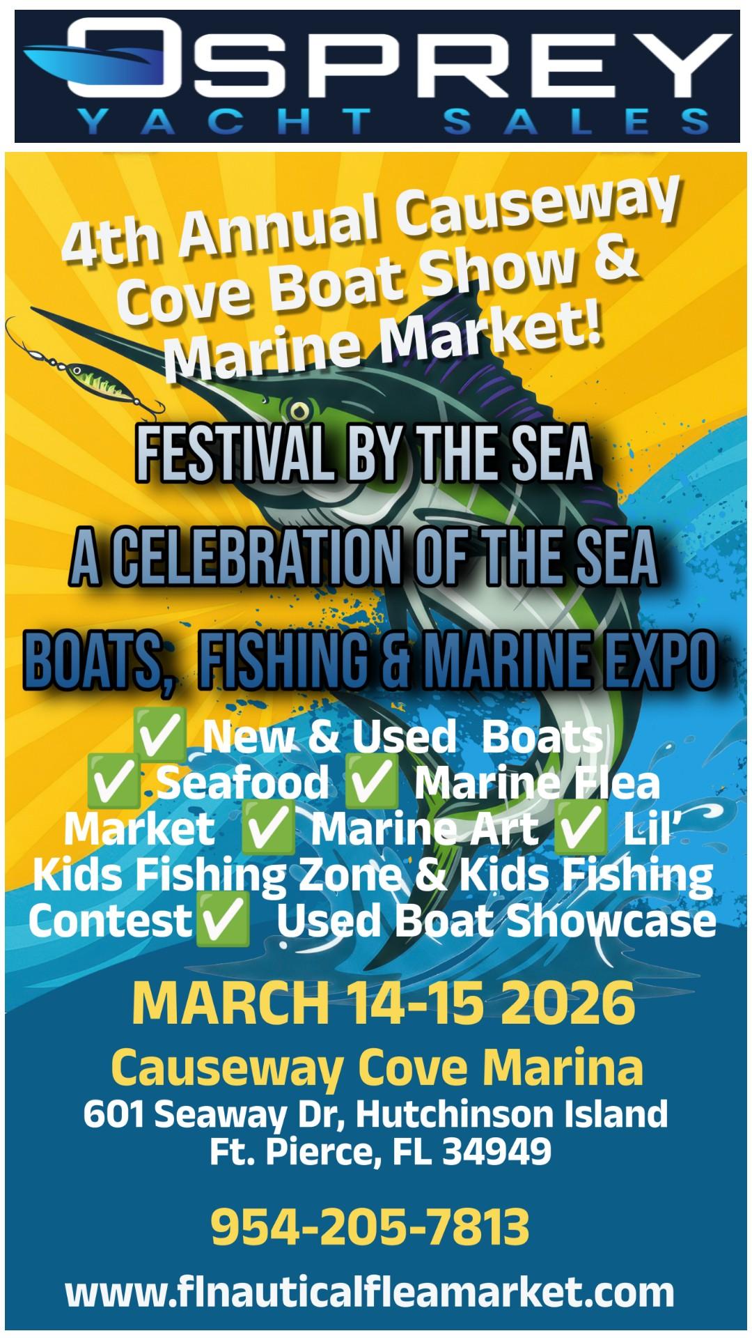 Causeway Cove Marina is excited to announce the Festival of the Sea, a two-day celebration of marine life, boating, and family fun! Taking place at the picturesque Causeway Cove Marina in Ft. Pierce, this event is a must-attend for boating enthusiasts, seafood lovers, and families looking for a vibrant day by the water. www.flnauticalfleamarket.com