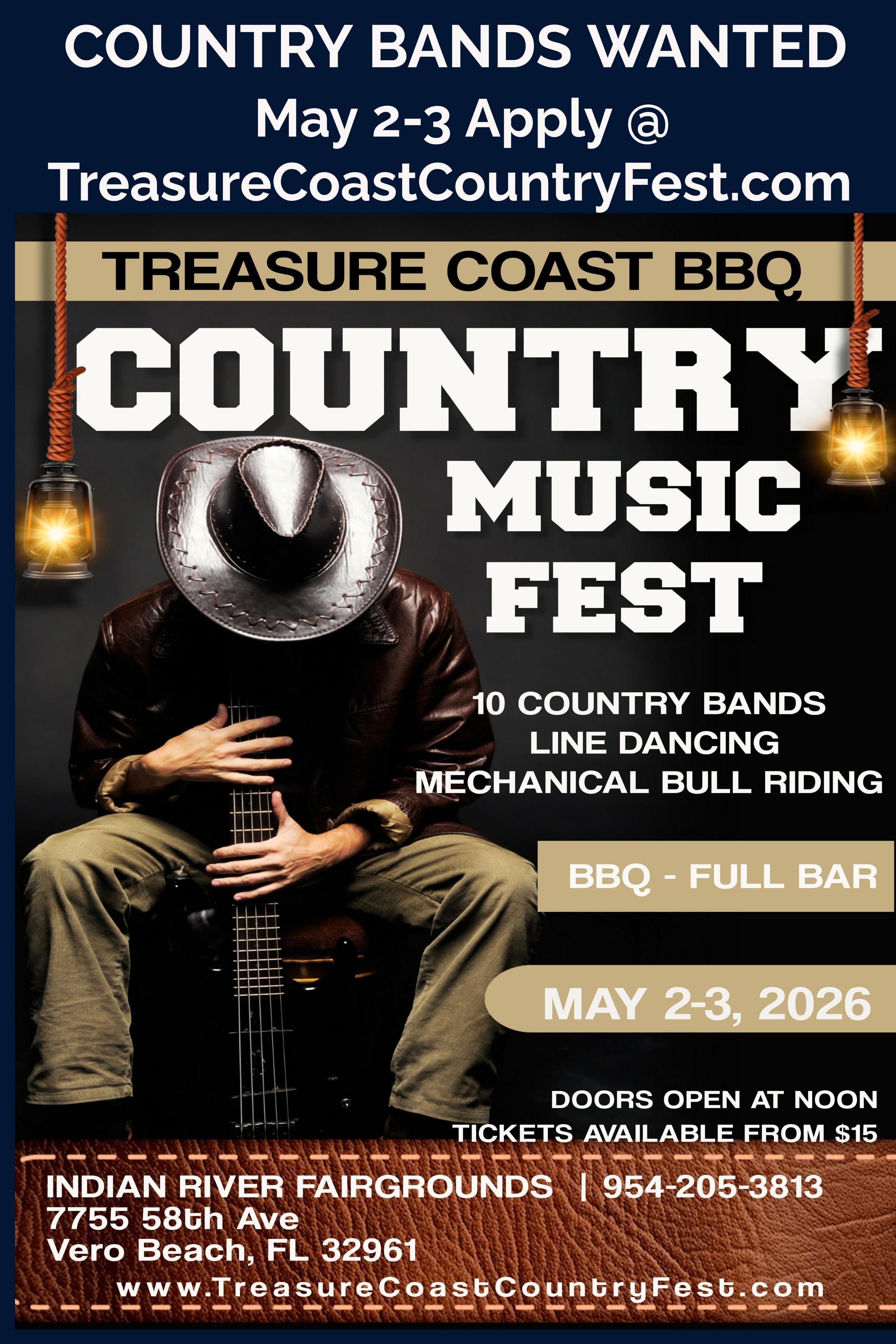 VERO BEACH, FL – The Treasure Coast CountryBBQ&MusicFestivaliscalling all country bands to join the excitement at this year’s event, taking placeonMay2-3,2026,attheIndian River Fairgrounds in Vero Beach, Florida. This is your chance to showcase your talent at one of the most anticipated country music festivals on Florida’s Treasure Coast! www.treasurecoastcountryfest.com