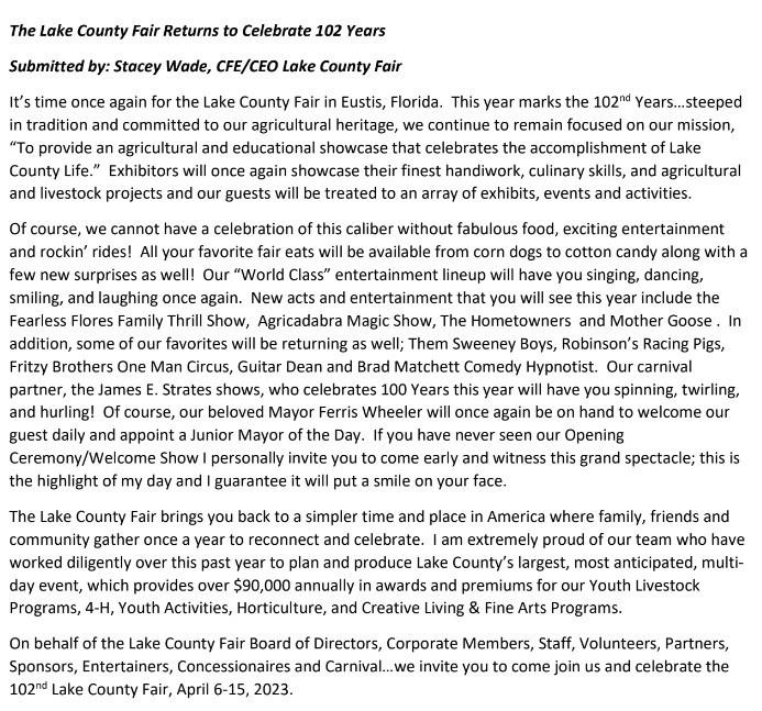 I trust everyone had a wonderful holiday season and is ready for fairs to roll through Florida. Since our last newsletter, many of our Florida Fairs had folks attending the IAFE Convention in Indianapolis.