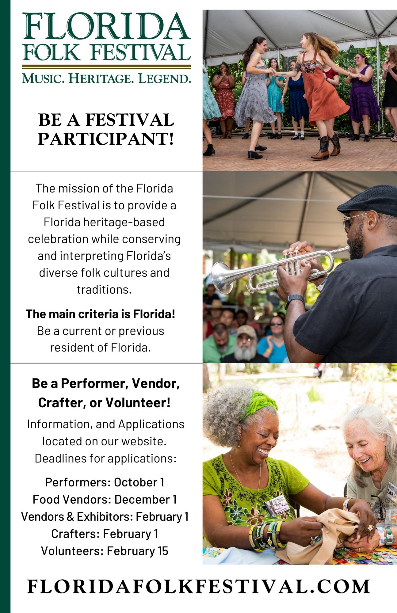 Along the banks of the historic Suwannee River in White Springs, Florida, folk artists gather to celebrate Florida’s land, people, and diverse cultural heritage. Since its humble beginning in 1953, the Florida Folk Festival has not only grown to become Florida’s most prestigious affair but also named “Florida’s Best Cultural Event.” The festival has been recognized by the Southeast Tourism Society as a “Top 20 Event” in the southeastern United States.