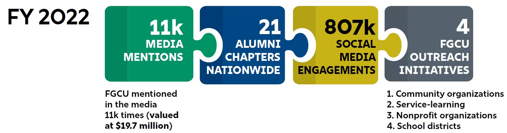 • In FY22, FGCU was mentioned 11,604 times in media (valued at more than $19.7 million) for topics other than Athletics (Cision).