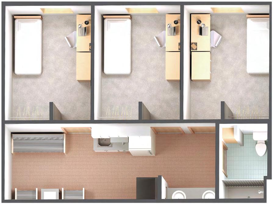Eagle and Osprey halls feature three-bedroom, single-occupancy suites with a kitchenette, common living area and shared bath.
