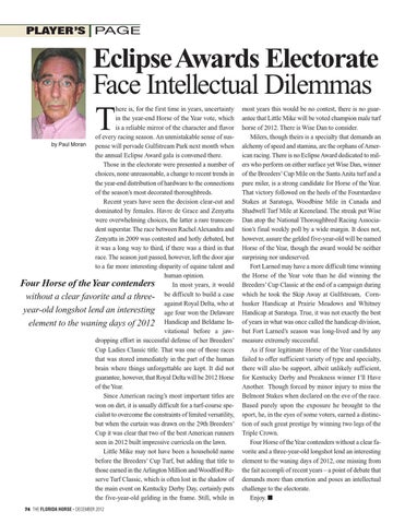 here is, for the first time in years, uncertainty in the year-end Horse of the Year vote, which is a reliable mirror of the character and flavor of every racing season. An unmistakable sense of susby Paul Moran pense will pervade Gulfstream Park next month when the annual Eclipse Award gala is convened there. Those in the electorate were presented a number of choices, none unreasonable, a change to recent trends in the year-end distribution of hardware to the connections of the season’s most decorated thoroughbreds. Recent years have seen the decision clear-cut and dominated by females. Havre de Grace and Zenyatta were overwhelming choices, the latter a rare transcendent superstar. The race between Rachel Alexandra and Zenyatta in 2009 was contested and hotly debated, but it was a long way to third, if there was a third in that race. The season just passed, however, left the door ajar to a far more interesting disparity of equine talent and human opinion. Four Horse of the Year contenders In most years, it would without a clear favorite and a three- be difficult to build a case against Royal Delta, who at year-old longshot lend an interesting age four won the Delaware element to the waning days of 2012 Handicap and Beldame Invitational before a jawdropping effort in successful defense of her Breeders’ Cup Ladies Classic title. That was one of those races that was stored immediately in the part of the human brain where things unforgettable are kept. It did not guarantee, however, that Royal Delta will be 2012 Horse of the Year. Since American racing’s most important titles are won on dirt, it is usually difficult for a turf-course specialist to overcome the constraints of limited versatility, but when the curtain was drawn on the 29th Breeders’ Cup it was clear that two of the best American runners seen in 2012 built impressive curricula on the lawn. Little Mike may not have been a household name before the Breeders’ Cup Turf, but adding that title to those earned in the Arlington Million and Woodford Reserve Turf Classic, which is often lost in the shadow of the main event on Kentucky Derby Day, certainly puts the five-year-old gelding in the frame. Still, while in 74 THE FLORIDA HORSE • DECEMBER 2012