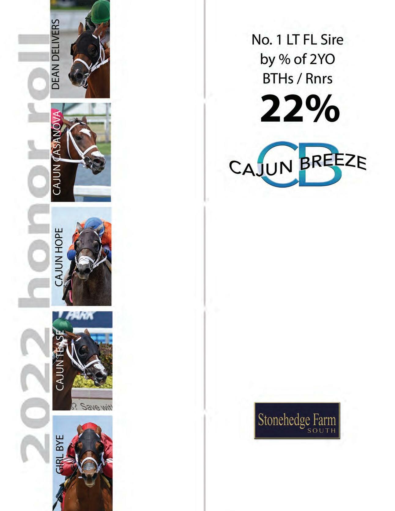 CAJUN BREEZE Congrats / Cajun Dawn, by Awesome Again Fee: $5,000 LFSN STONEHEDGE FARM SOUTH P.O. Box 87 • Williston, FL 32696 Inquiries to: Larry King, Farm Manager Tel: 352-528-4951 • Fax: 352-528-4952 Email: stonehedge@webkraft.net