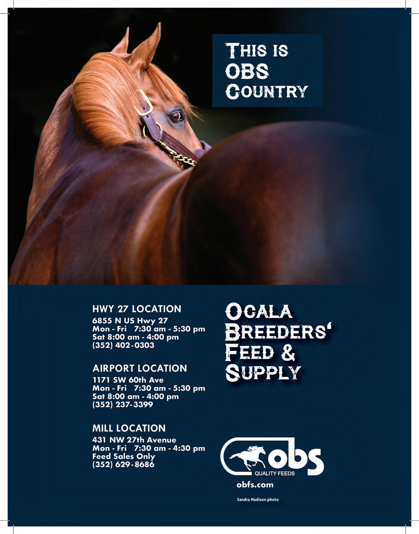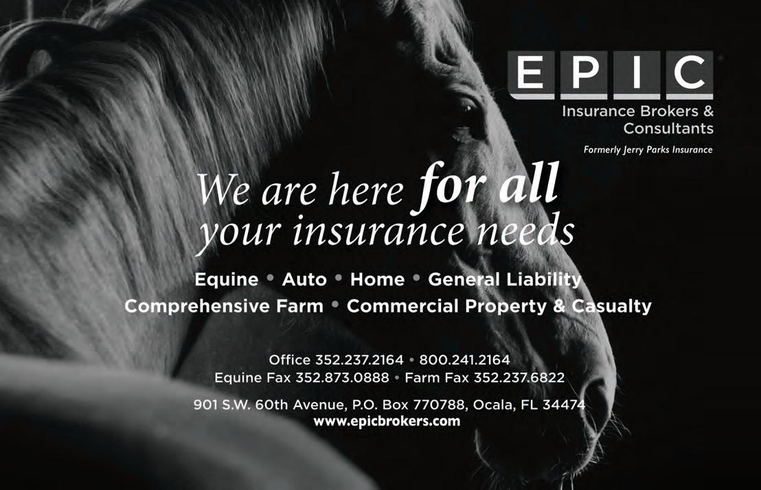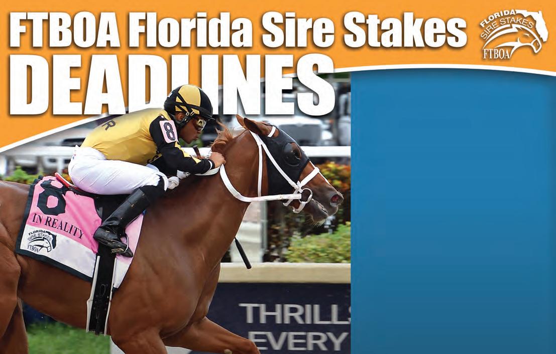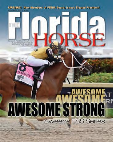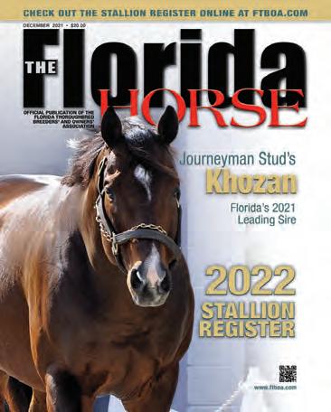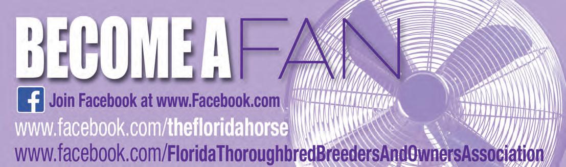 Our Media horse Horse Capital of the World Our Media Partnered with Kaplan Advertising © THE FLORIDA HORSE (ISSN 0090-967X) is published monthly except July by THE FLORIDA HORSE, INC., 801 SW 60th Ave., Ocala, Florida 34474, including the annual Statistical Review in February. Opinions expressed herein are those of the authors and do not necessarily reflect those of Florida Equine Communications or the Florida Thoroughbred Breeders’ and Owners’ Association. Publication of any material originating herein is expressly forbidden without first obtaining written permission from THE FLORIDA HORSE©. Statistics in the publication relating to results of racing in North America are compiled from data generated by Daily Racing Form, Equibase, Bloodstock Research Information Services, and The Jockey Club Information Systems Inc., the copyright owners of said data. Reproduction is prohibited. Advertising copy deadline 5th of month preceding publication. Subscriptions and change of address: Please mail to – Circulations Department. THE FLORIDA HORSE, 801 SW 60th Ave., Ocala, Florida 34474.