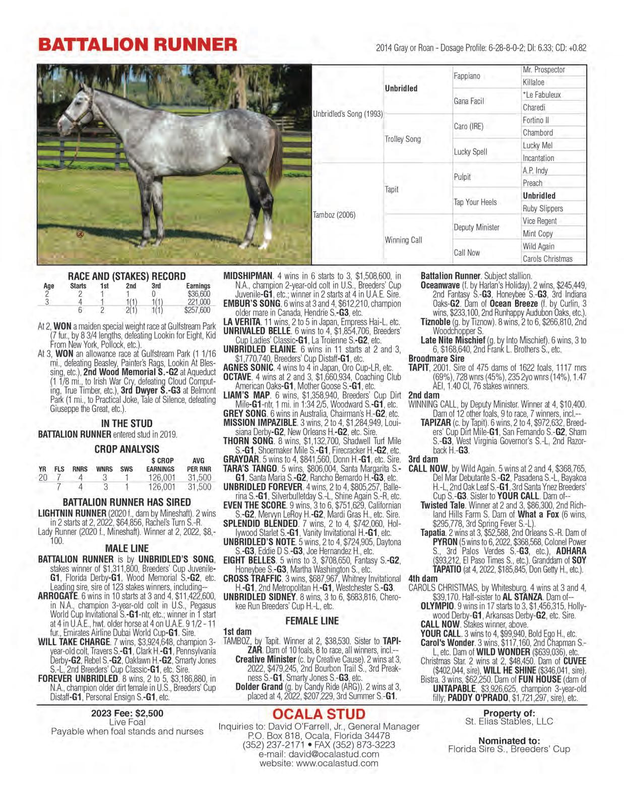 33 Battalion Runner Ocala Stud Unbridled’s Song $126,001 4 3 1 1 0