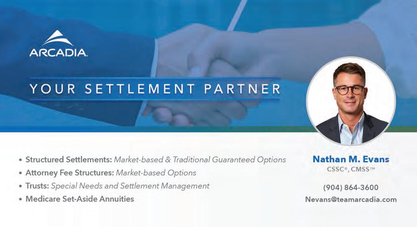 to see how we can help your firm. WHEN YOU NEED AN EXPERT IN YOUR CORNER FOR THE DIFFICULT ISSUES AT SETTLEMENT, TURN TO SYNERGY. RUDY RODRIGUEZ-CHOMAT Rchomat@synergysettlements.com BRANDON APPLEBY Bappleby@synergysettlements.com TROY MCCOY Tmccoy@synergysettlements.com MARCI GORDON Mgordon@synergysettlements.com NORTH FLORIDAWEST FLORIDACENTRAL FLORIDA - SOUTH FLORIDAAllowing Trial Lawyers to Focus on What They Do Best.® EAST FLORIDA - CALEB LYONS Clyons@synergysettlements.com JEFFERY FAULKNER Jfaulkner@synergysettlements.com EAST FLORIDASee how we can help. Call (877) 242-0022 SynergySettlements.com LIEN RESOLUTION MSP COMPLIANCE GOVERNMENT BENEFIT PRESERVATION SETTLEMENT PLANNING GROUP PROJECTS | ATTORNEY FEE DEFERRAL EAGLE ® BENEFACTOR–$10,000 Medical providers and Hospitals have collection lawyers working against you. It’s time to level the playing field. MEDICAL DEBT AND LIEN LITIGATION LAW FIRM Michael Walrath, Esq | 786-332-6855 | 305-609-0800 | www.walrathlaw.com