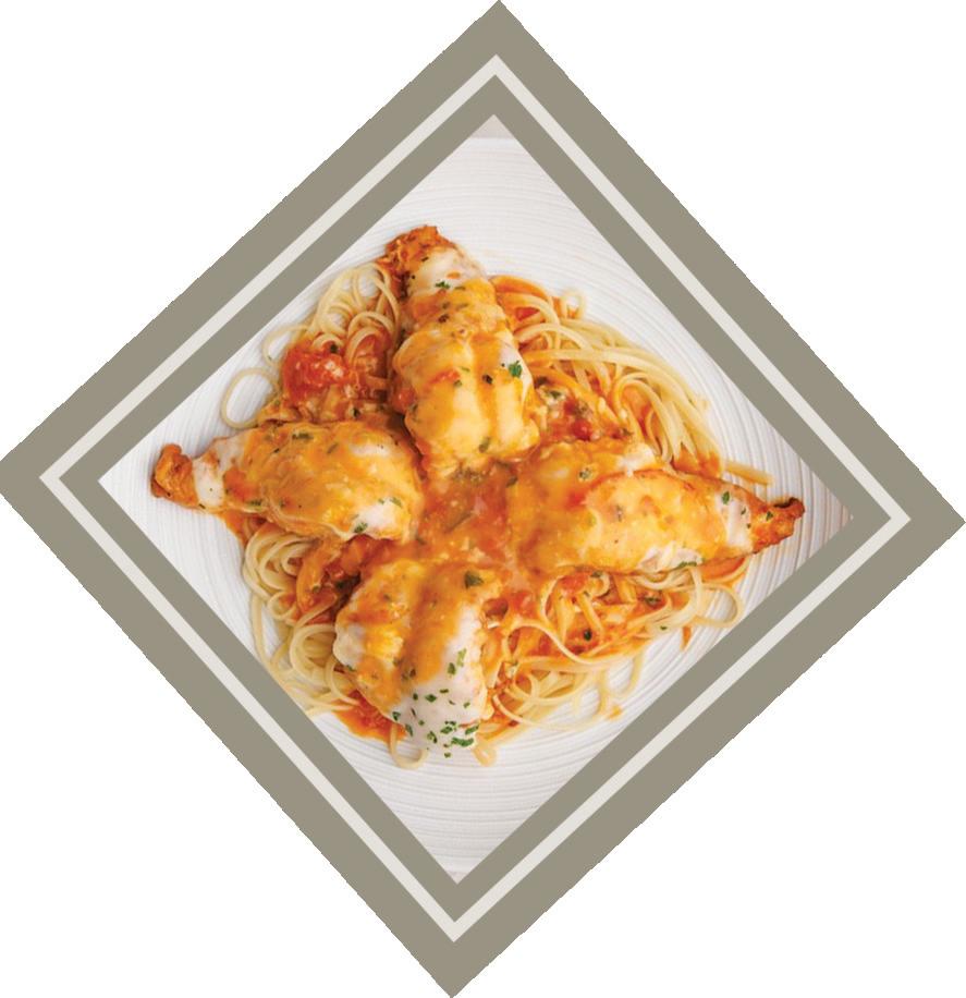 Rosie’s Shrimp Parmigiana Served in a pink sauce with mozzarella and linguine.