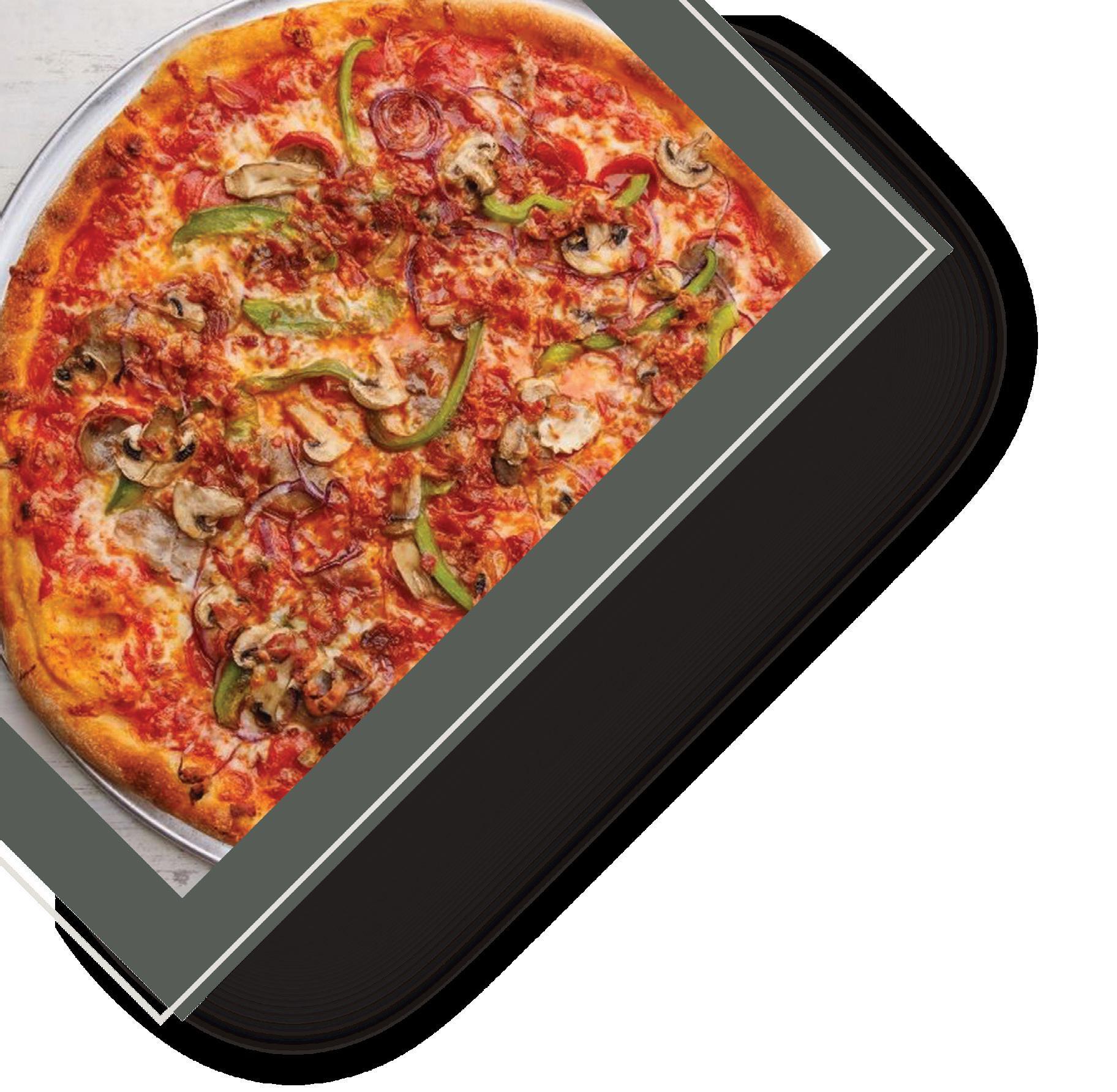 Featuring tomato sauce, pepperoni, sausage, bacon, mushrooms, green peppers, red onion and mozzarella.