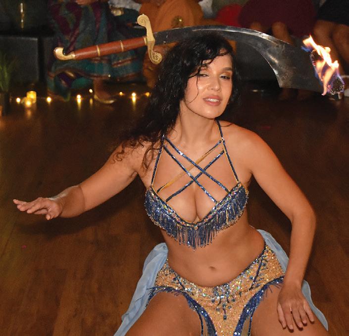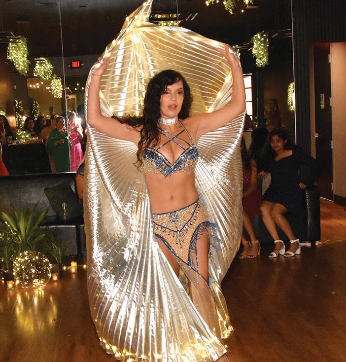 (Left to right) Masala Mantra owner Purnima Patel, Westlake Councilwoman Charlotte Leonard, Women’s Chamber Executive Director Selena Samios and Reisha Roopchand Allen of the Women’s Chamber of Commerce Foundation; Donna Fanelli, Ria Roopchand, Sylvia Roopchand, Rena Nannan and Rosa Rodriguez; and belly dancer Lauren Cheek provides entertainment.