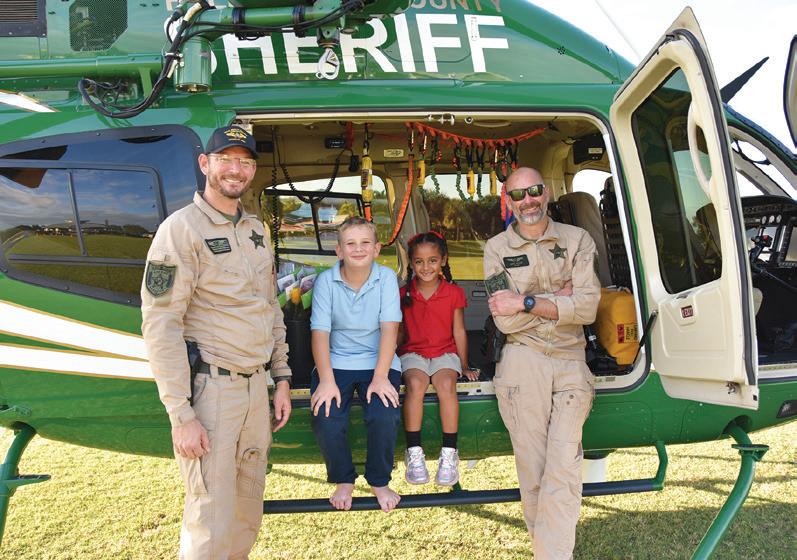 (Left to right) Mayor Jeff Hmara, Councilwoman Jan Rodusky, Vice Mayor Richard Valuntas, Cpl. Read, Councilwoman Sylvia Sharps, Capt. Ulrich Naujoks, Carolyn Hmara and drone operator Sgt. Levey; Deputy Logan Werner, Jaxon Tufts, Khloe Hudson and Deputy Andy Tucker; Justine Miller with Deputy Sara Cannon; and K9 therapy dog Gracie with Claire Plevin.