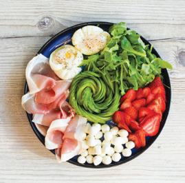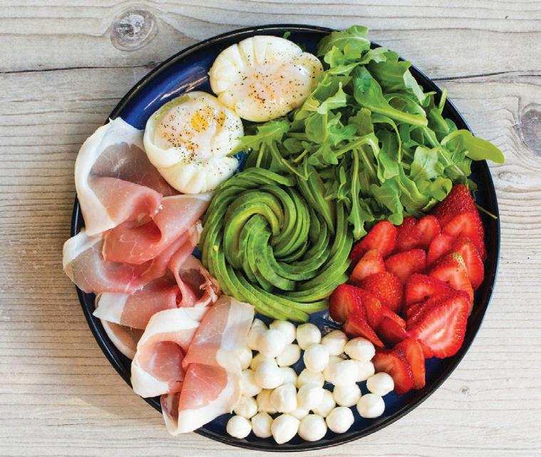 (Middle row) A mocha coffee with the Avocado Madness Salad featuring mixed greens, grape tomatoes, burrata, avocado, balsamic glaze and basil oil. (Bottom row) Peach chamomile tea with Avocado Toast Caprese featuring avocado, mozzarella, grape tomatoes, basil oil and balsamic glaze.