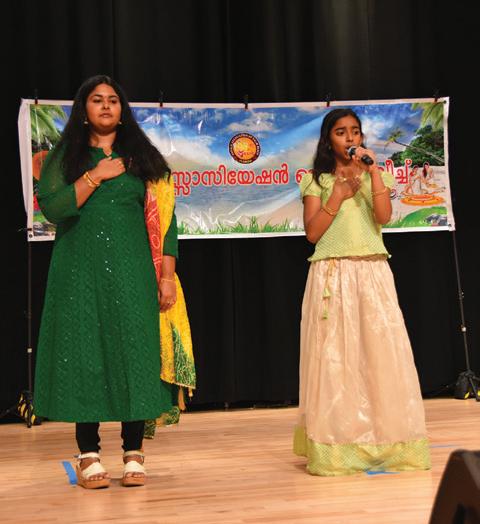 (Left to right) Sajitha Raj, Sanil Prakash, Ramya Sudhagar, Elizabeth Jose, Sherin Leo, Charutha Balram, Juna Thomas, Rohini Nair, Aisal Brown and Lona DSouza; Kerala Association President Mathew Thomas greets King Mahabali; Benjamin Thadavanal as King Maahabali with Mayor Jeff Hmara; and Emily Kurian sings the Indian national anthem, and Anjana Vijin sings the American national anthem.