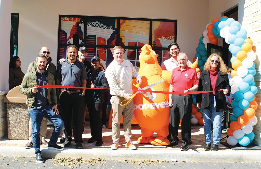 Popeyes Louisiana Kitchen to the community. The new restaurant is located at 10101 Southern Blvd., Suite 11, in the Village Shoppes plaza near Burlington. Shown here, Mayor Jeff Hmara and Councilwoman Jan Rodusky join the Popeyes crew to help cut the ribbon.