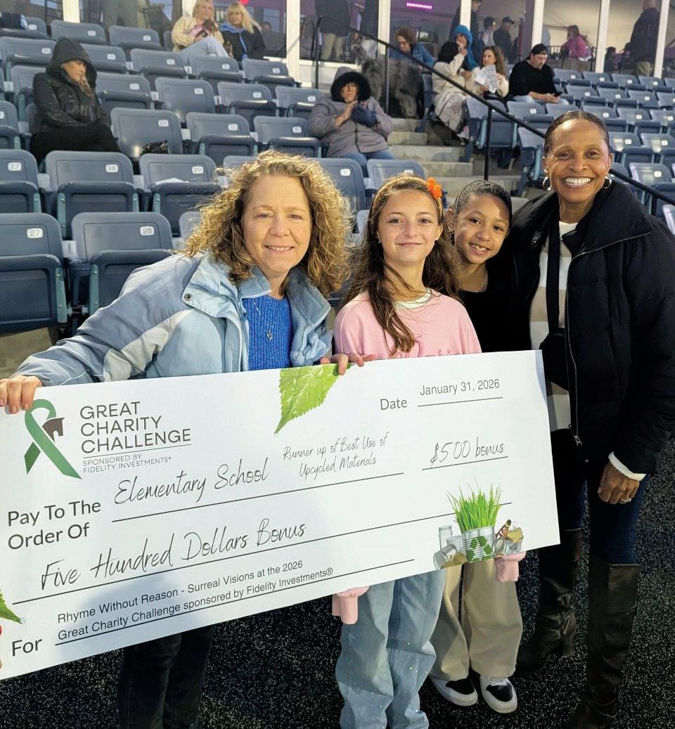 Art teacher Erica Bordonaro and students Victoria McGluckin and Kylee Chong accept their runner-up check with Principal Dr. Maria Vaughan.