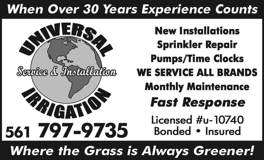 UNIVERSAL IRRIGATION SERVICE & INSTALLATION — New Installations sprinkler repair pumps/Time Clocks. We Service all brands. Monthly Maintenance. Fast Response. Lic. #U-10740 Bonded Insured. 561-795-9735