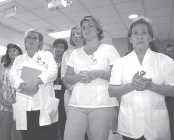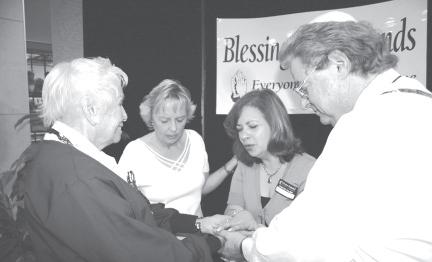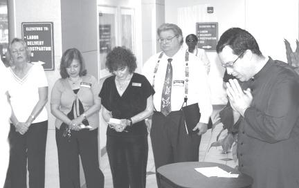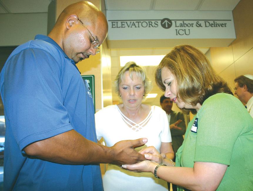 In honor of National Nurses Week, Wellington Regional Medical Center hosted a “blessing of the hands” ceremony on Friday, May 9 in the hospital lobby. Clerics participating in the blessing of nurses and other staff members included Rabbi Bertram Kieffer of Temple Beth Zion in Royal Palm Beach, Father Brian Lehnert of St. Therese de Lisieux Catholic Church in Wellington, Rev. Jacqueline Leveron of Good Shepherd United Methodist Church in West Palm Beach and Madaline Lawrence, a licensed teacher at Unity Church of Delray Beach and chaplain at WRMC. Shown here, Luis Rodriguez receives his blessing from Leveron while Sandy Stegall looks on. MORE PHOTOS, PAGE 9