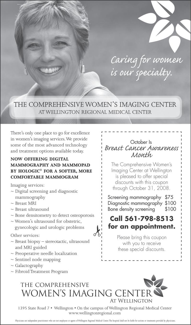 women. MammoPad does not interfere with the mammogram image and, in fact, because patients are more relaxed during their mammograms, many technologists report being able to get a more complete mammogram image. Reducing discomfort could even encourage women to comply with annual mammogram guidelines. Women of Wellington and the surrounding areas are fortunate that a softer mammogram is available locally. For more information, call Wellington Regional Medical Center at (561) 798-8500 or visit the hospital’s web site at www.wellingtonregional.com.