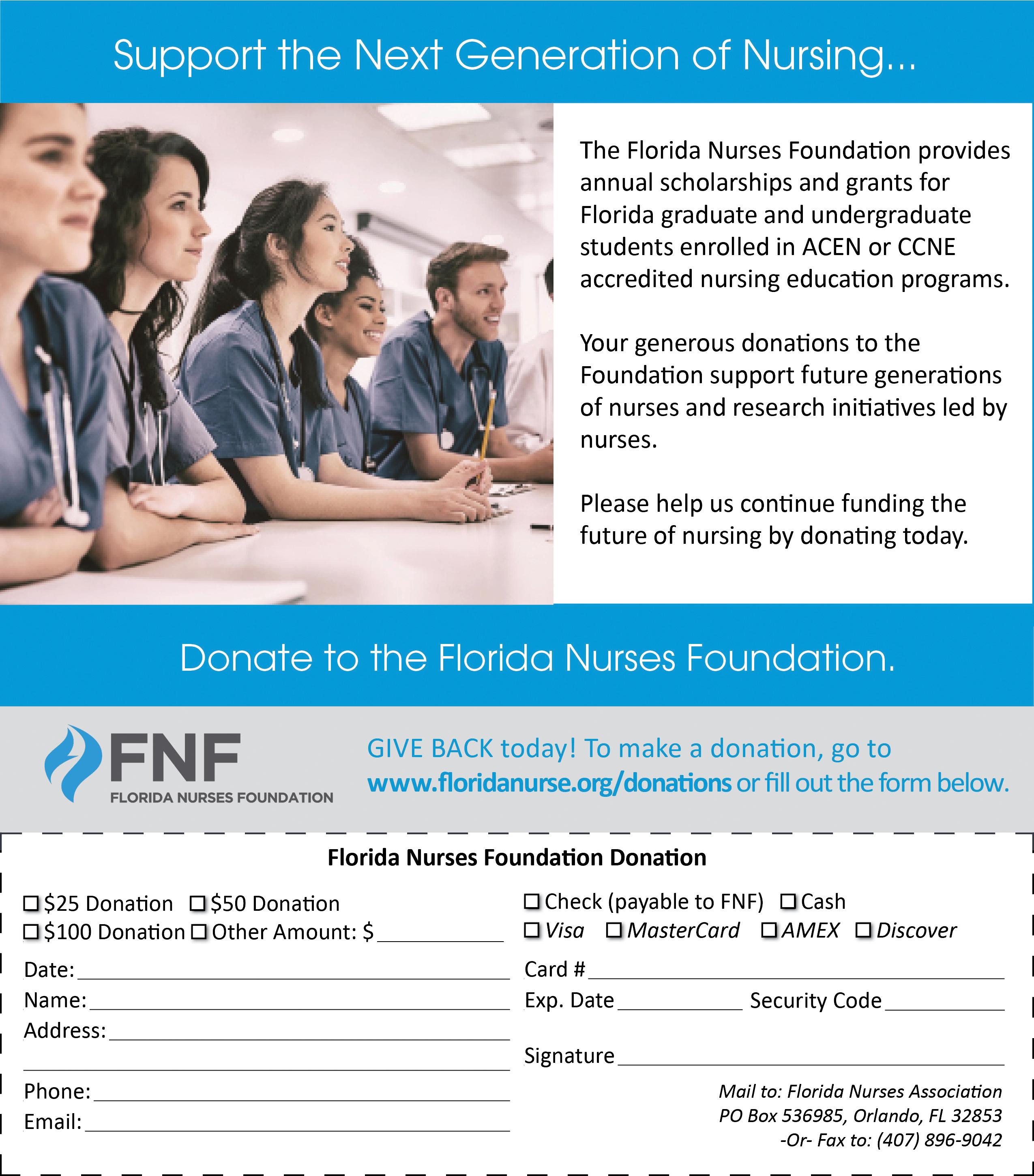 When one thinks of the Florida Nurses’ Foundation the immediate spotlight is on education and research grants for nurses to further their development and that of the profession. Yet, as highlighted in the February Florida Nurse , another important and less known initiative is support for our Nurses in Need . Yes, COVID-19 has changed the environment in which we work. Yes, COVID-19 has changed the way we find leisure. And, yes, COVID-19 has even changed the number of nurses available to care for our patients, our families and even ourselves. The American Nurses Association notes that over 500 nurses have died of COVID-19 as a result of caring for their patients – Florida has lost 35 ( http://www.nursingworld.org/fallen). Nurses are givers and many have given the ultimate – their lives. Let us during this pandemic, who continue to live, give not with our lives, but with our wallet to our Nurses in Need fund. COVID-19 has placed many of our own in mental and financial crisis. No amount is too small. The Nurses In Need Fund is a resource all of us can access when a financial need arises – all we need to do is ask. For more information on the program or to donate to the fund go to www.floridanurse.org/NursesInNeed