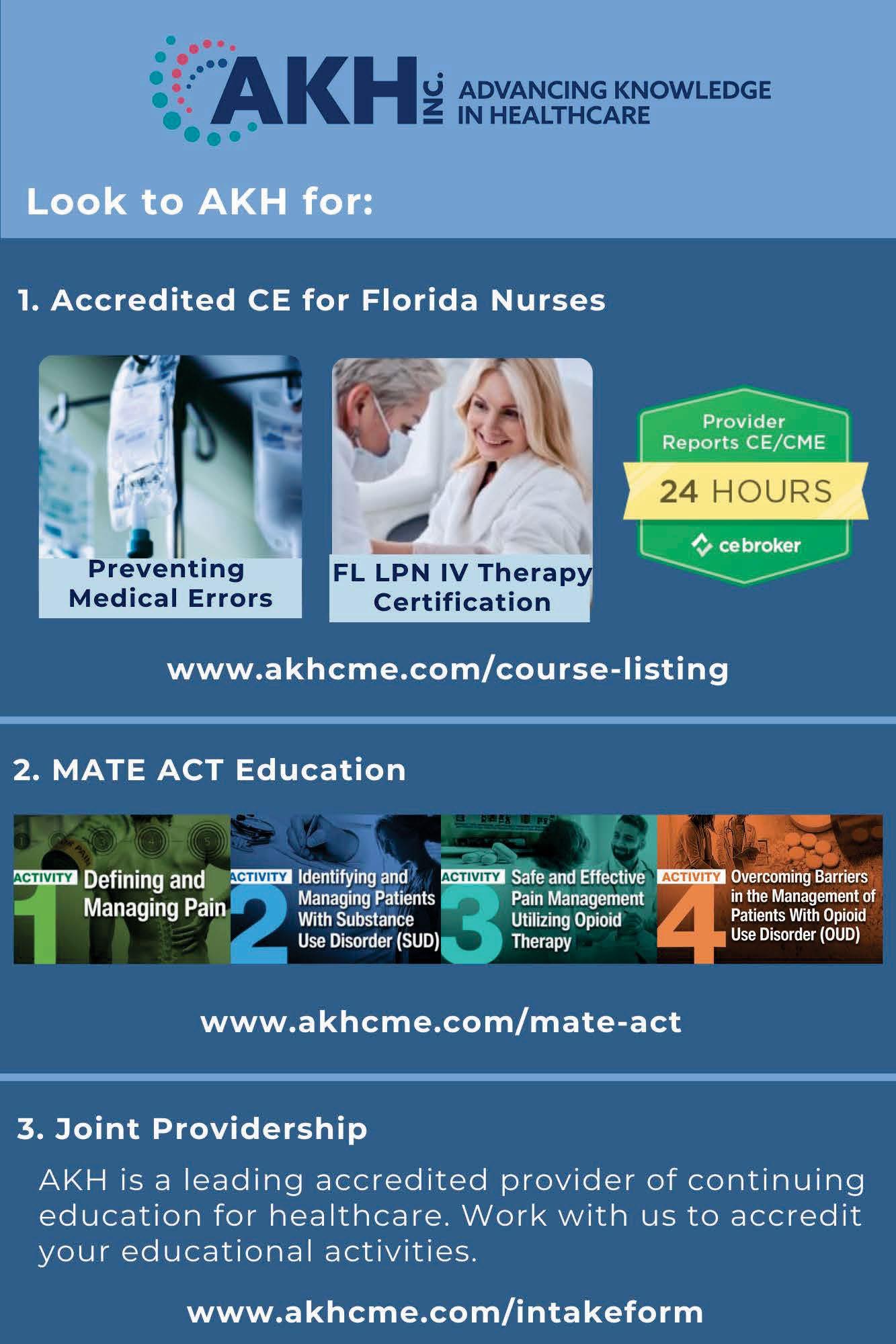 Acceptance of advertising does not imply endorsement or approval by the Florida Nurses Association of products advertised, the advertisers, or the claims made. Rejection of an advertisement does not imply a product offered for advertising is without merit, or that the manufacturer lacks integrity, or that this association disapproves of the product or its use. FNA and Health eCareers shall not be held liable for any consequences resulting from purchase or use of an advertiser’s product. Articles appearing in this publication express the opinions of the authors; they do not necessarily reflect views of the staff, board, or membership of FNA or those of the national or local associations.