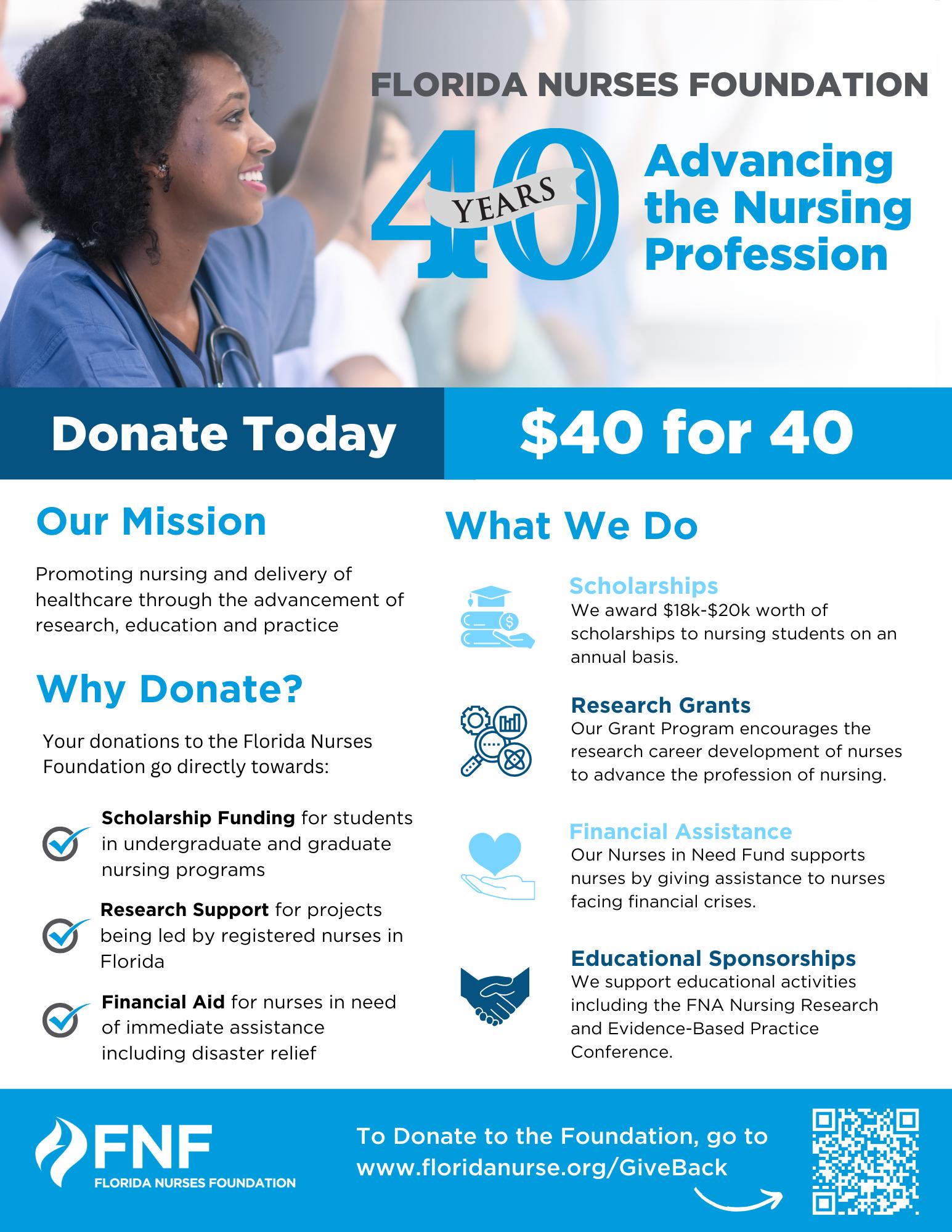 The Florida Nurses Foundation, founded in 1983, takes immense pride in championing the nursing profession across our great state. Over the past 40 years, we’ve awarded more than $555k in scholarships and research grants. The scholarships have supported the academic aspirations of over one thousand nurses. Our research grants have played a pivotal role in advancing the science and art of nursing. Furthermore, our “Nurses in Need” program stands as a beacon of hope, offering financial relief to Registered Nurses contending with age-related infirmities, illnesses, disabilities, or unexpected catastrophes. The heart of our mission has always been the well-being and progression of nurses in promoting a healthy Florida.