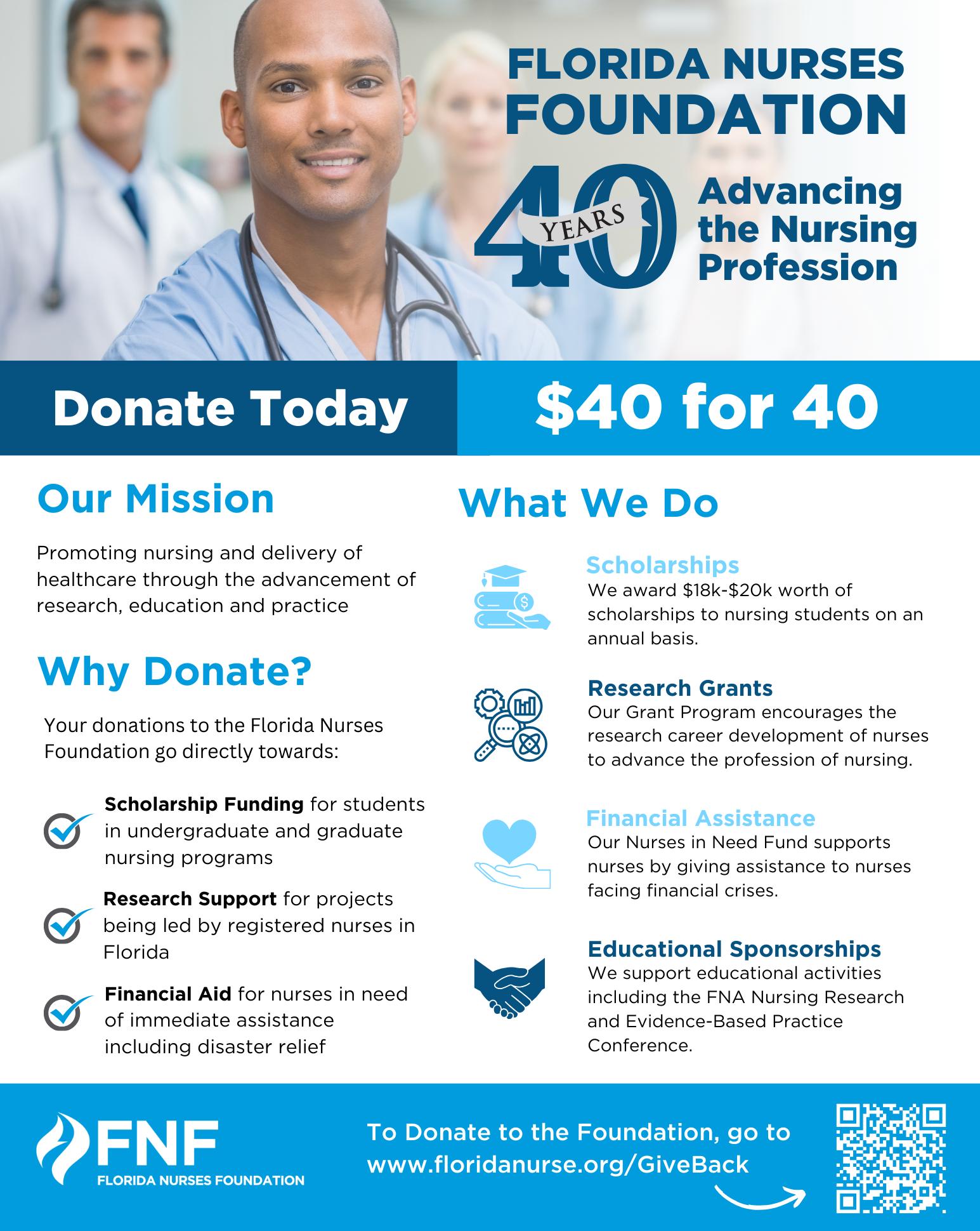 As the Florida Nurses Foundation celebrates 40 years of service and looks forward to a future marked by new possibilities, your support becomes integral to its continued success. By donating to the foundation, you play a pivotal role in shaping the future of nursing, promoting healthcare excellence, and contributing to the well-being of communities across Florida. Together, let’s build a legacy of compassion, education, and innovation in nursing that will resonate for decades to come.
