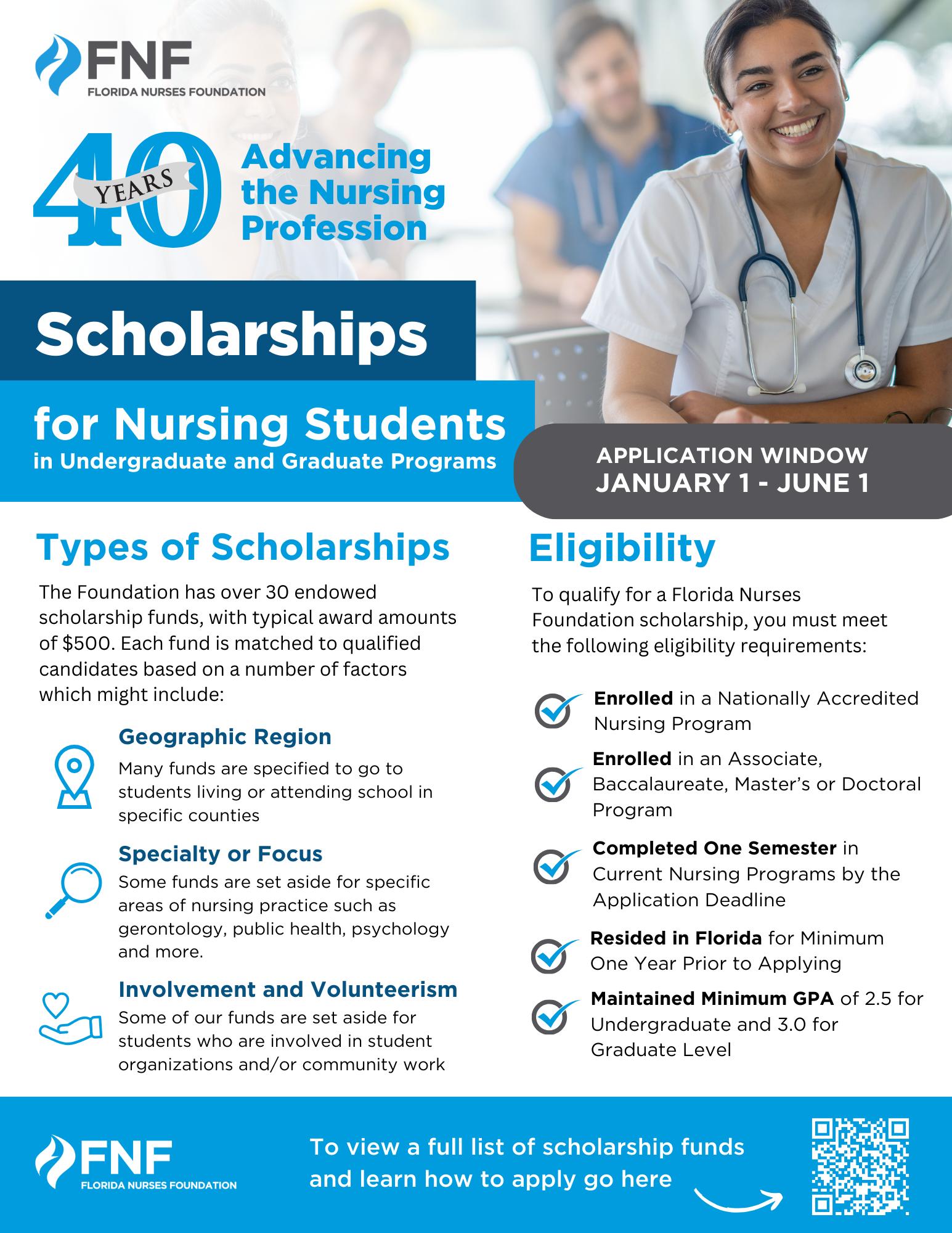 About our Scholarships: The Foundation has over 30 scholarships available for nursing students residing in Florida and currently enrolled in a nationally accredited nursing program. Applicants must have completed at least one semester in their nursing program to qualify. Some of the funds have specific application requirements such as geographic location or nursing specialty. The Foundation offers scholarships for all levels of study including basic nursing programs, master’s level, and doctoral programs.