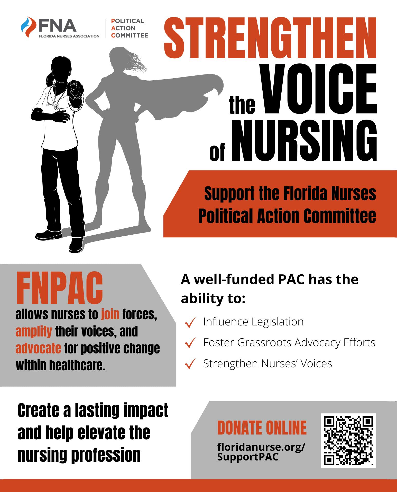 Your contribution matters. Donate to the PAC today and help us shape a brighter future for nursing and healthcare. To make a donation or learn more about the Florida Nurses Political Action Committee, please visit our website at www.floridanurse.org/FNPAC