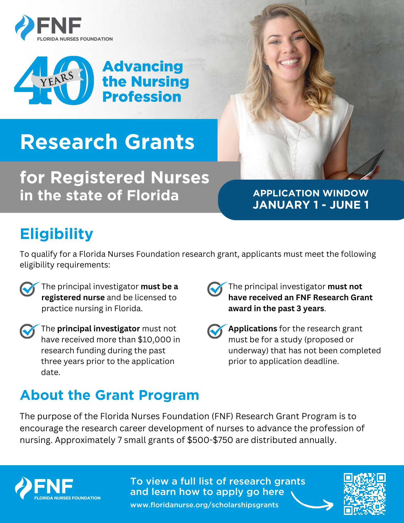 About our Grants: The Florida Nurses Foundation has several opportunities for Nurse Researchers to receive grants. The purpose of the Florida Nurses Foundation (FNF) Research Grant Program is to encourage the research career development of nurses to advance the profession of nursing.