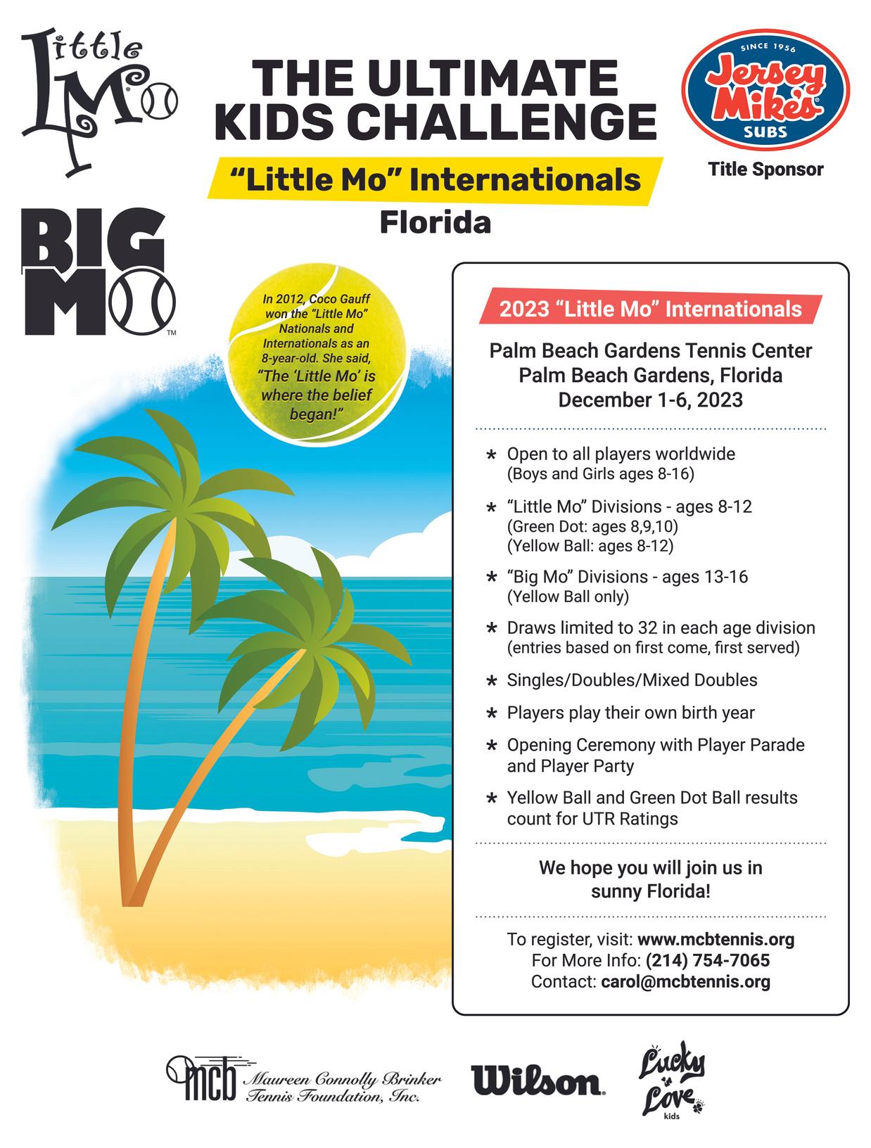 Little Mo: Save the date! The “Little Mo” Internationals (ages 8-16) are scheduled for San Diego, California: February 6-11. Register for the event at mcbtennis.com .