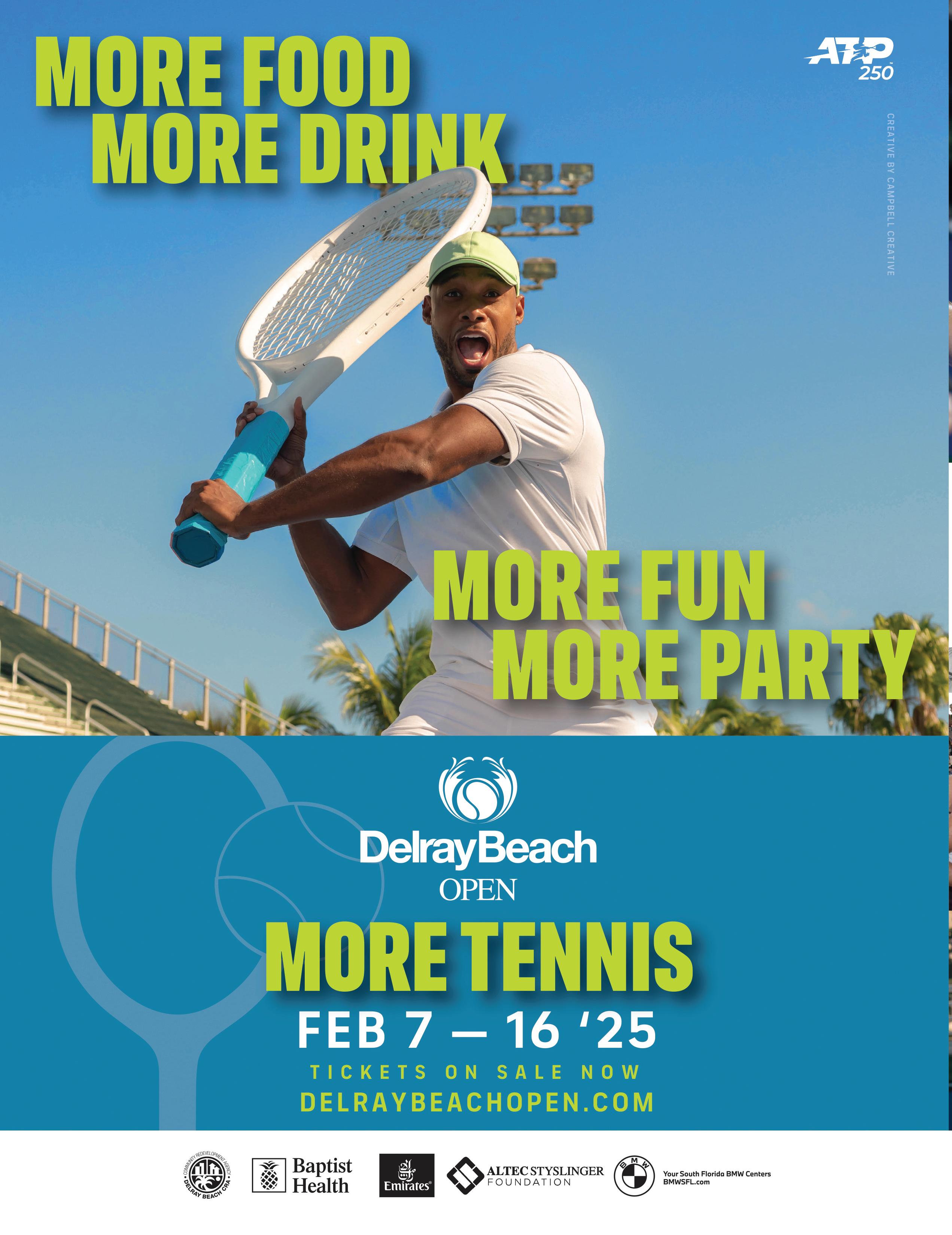The ATP Tour’s first North American hard-ctourt event of the outdoor season annually plays in front of over 60,000 fans and reaches television audiences in over 100 countries. New for the Delray Beach Open in 2025 is the addition of new food and beverage options and VIP events, in addition to the always popular Delray Beach Open Food & Wine Series, which will feature over 40 of the top restaurants, food purveyors, and spirit partners in South Florida showcasing there tasting bites and cocktails to the masses.