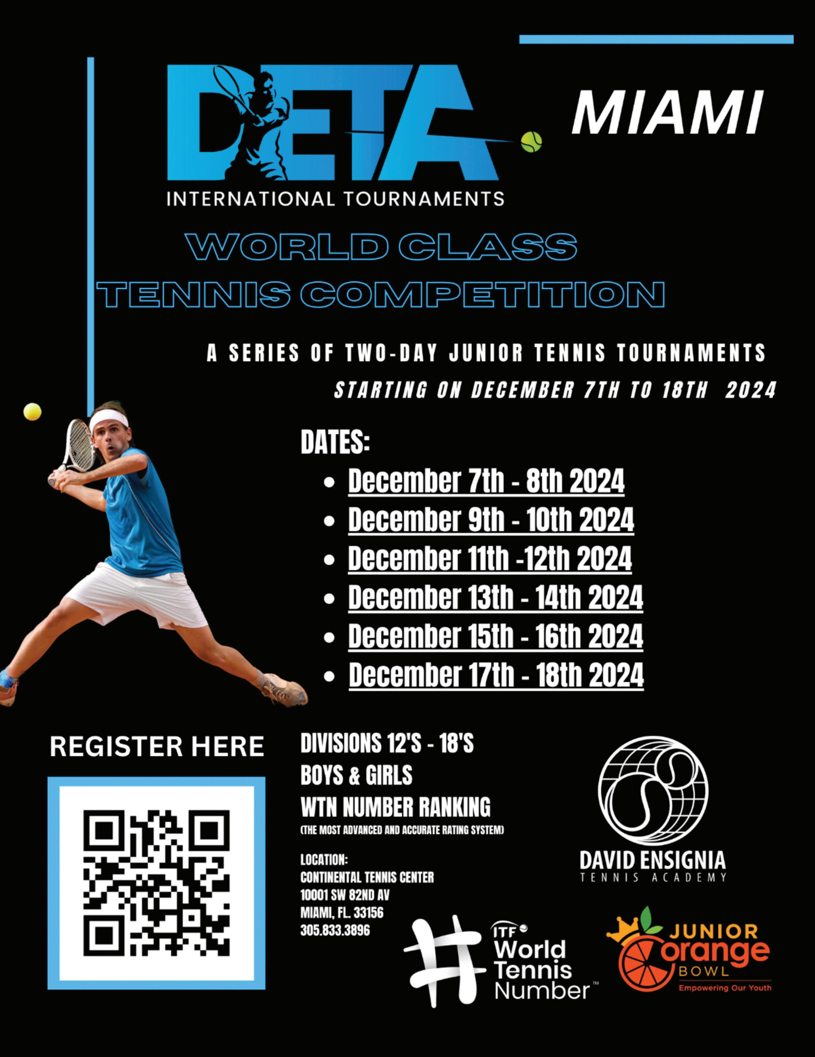 The David Ensignia Tennis Academy has unveiled its official schedule for the 2024 DETA International Tournaments, 11 days of elite junior international tennis competition at Continental Park Tennis Center in East Kendall and Miccosukee Golf & Country Club, in West Kendall.
