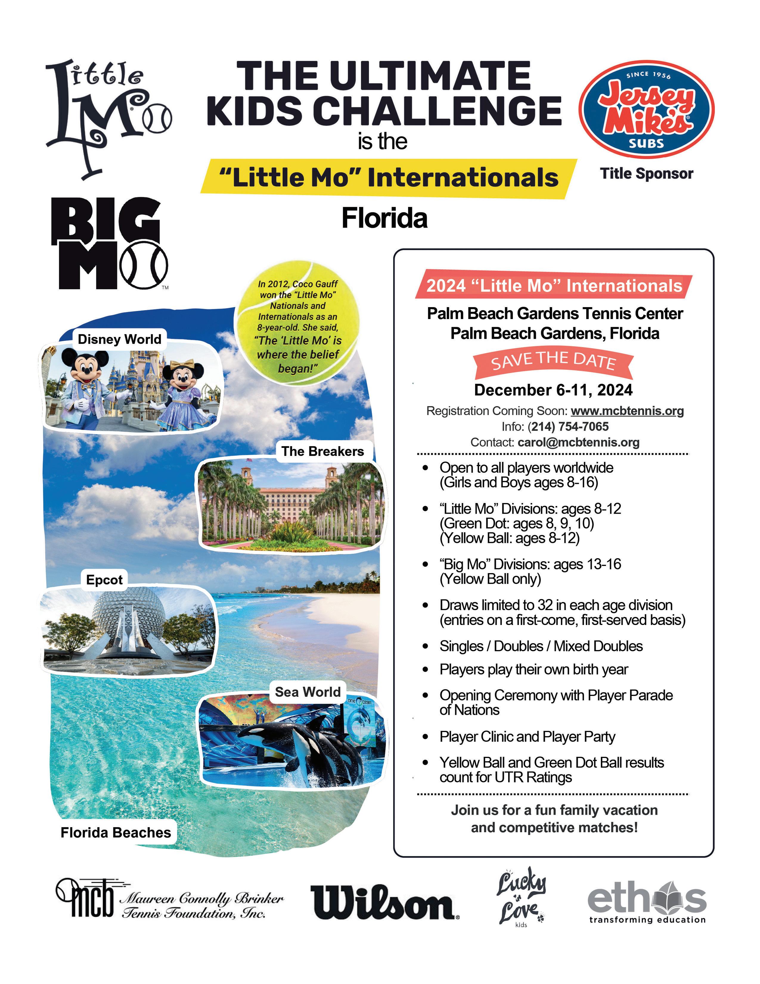 Save the date! The “Little Mo” East Internationals (ages 8-16) is scheduled for December 6-11, 2024 at the Palm Beach Garden Tennis Center in Palm Beach Gardens, FL. Registration opens soon at mcbtennis.com.