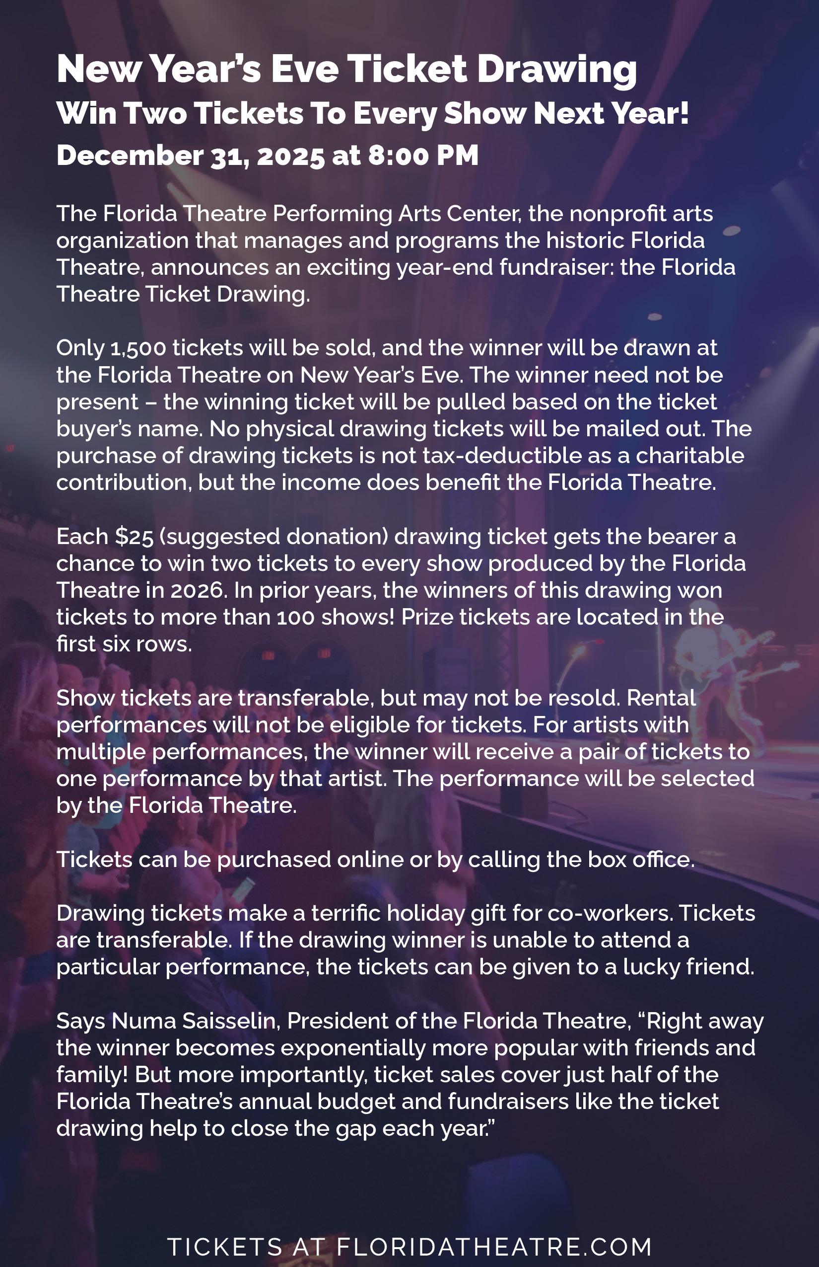 Add your name to the Florida Theatre’s email and mailing lists at the Ticket Office, by calling 904.355.5661 or at floridatheatre.com. Name, address, phone and email is required of all ticket purchasers in case of a problem with your order, or in case a show is cancelled or postponed. Ticket buyers are automatically entered on the Theatre’s mail and email lists, and will receive information about upcoming performances. An opt-out option is offered, but all information is confidential. The Florida Theatre does not sell, rent, trade or otherwise allow other entities access to its mailing lists.