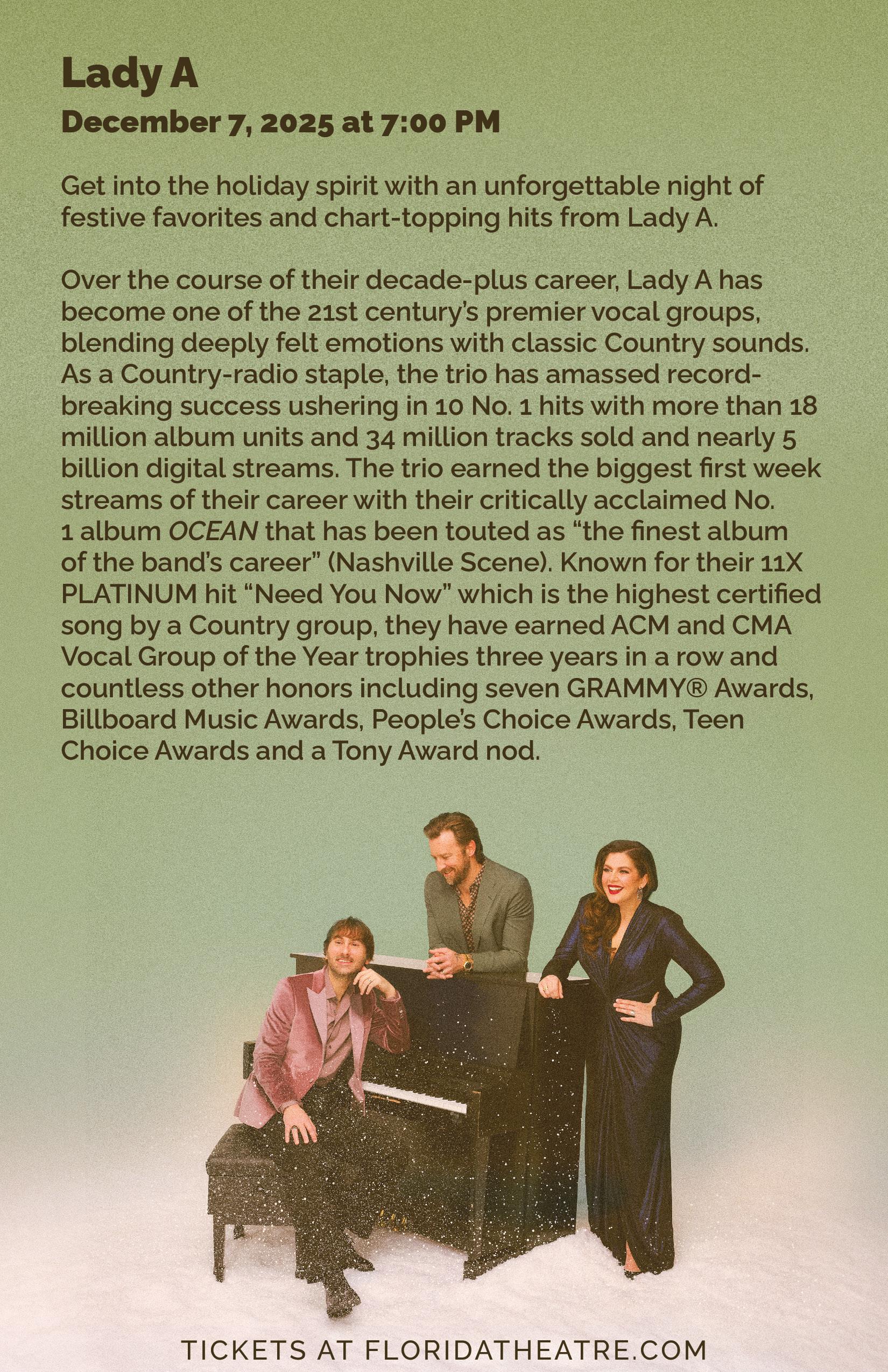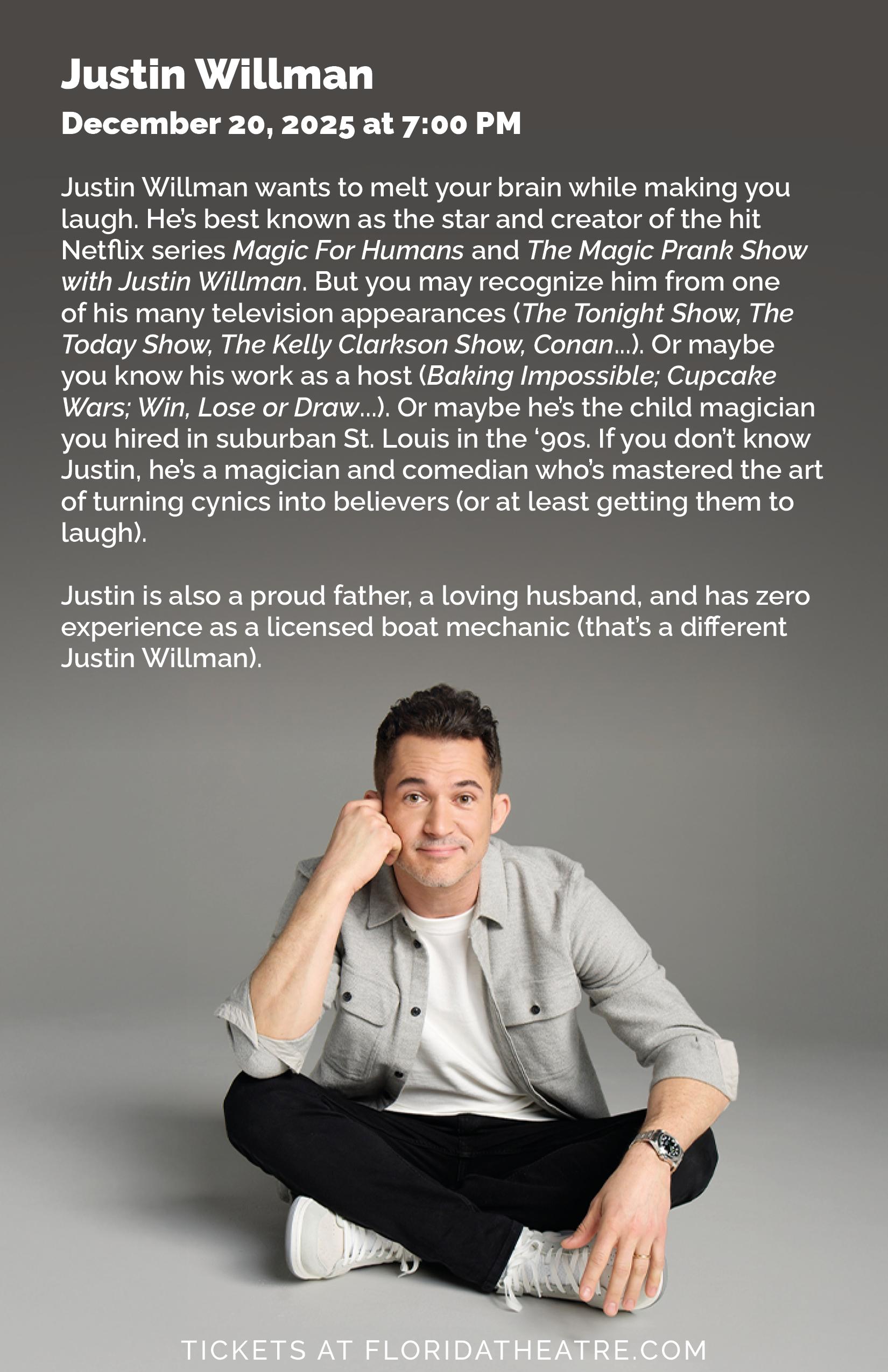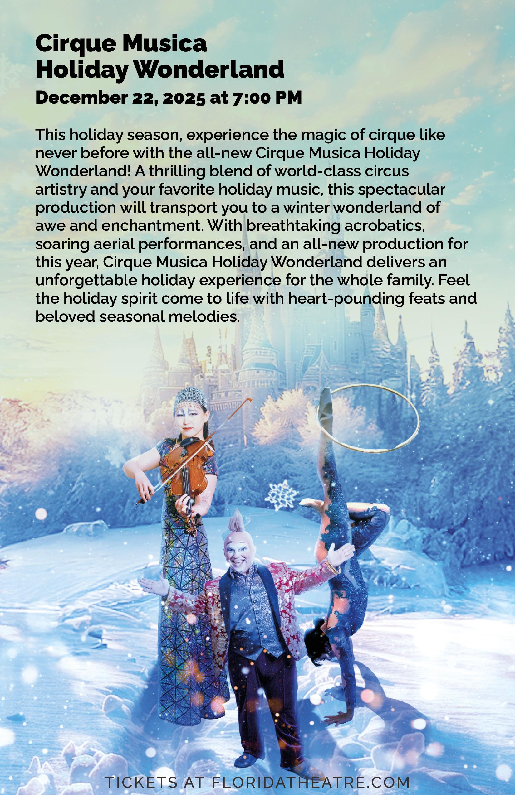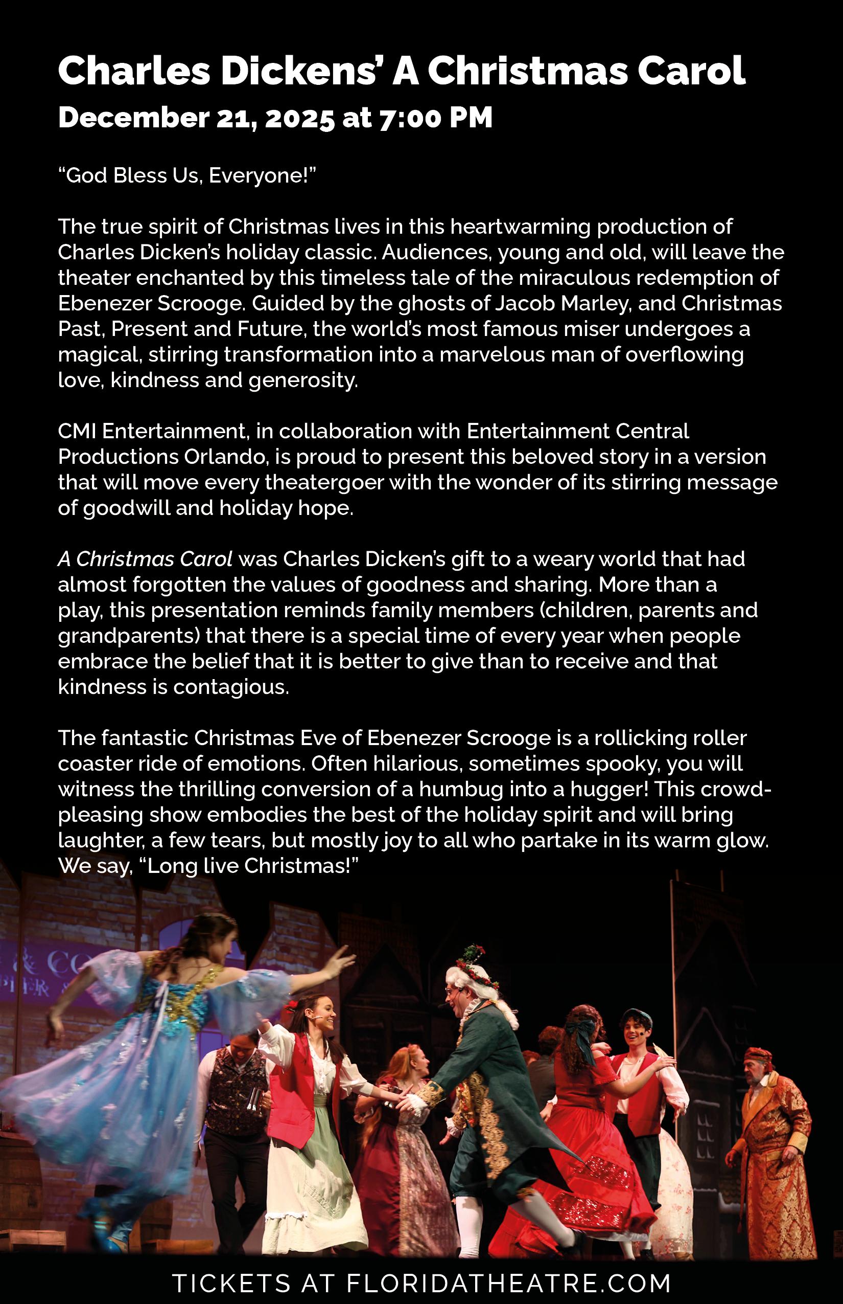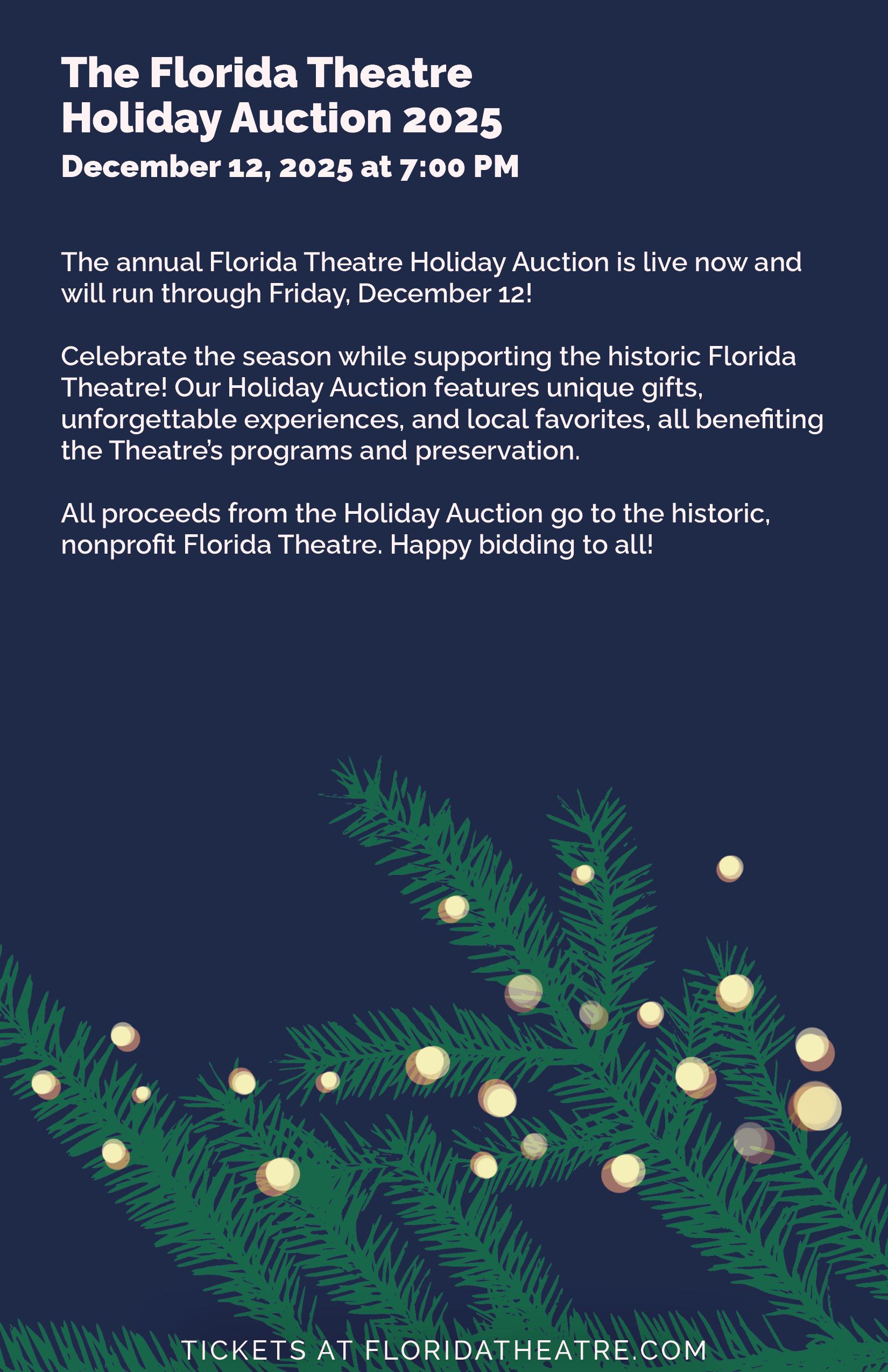 Show tickets and gift certificates make great presents and stocking stuffers, and because of the diversity of our offerings, we’ve got a show for almost everyone in your family. Don’t forget that if you find yourself on Christmas Eve needing a few more presents, floridatheatre.com is open 24 hours a day.