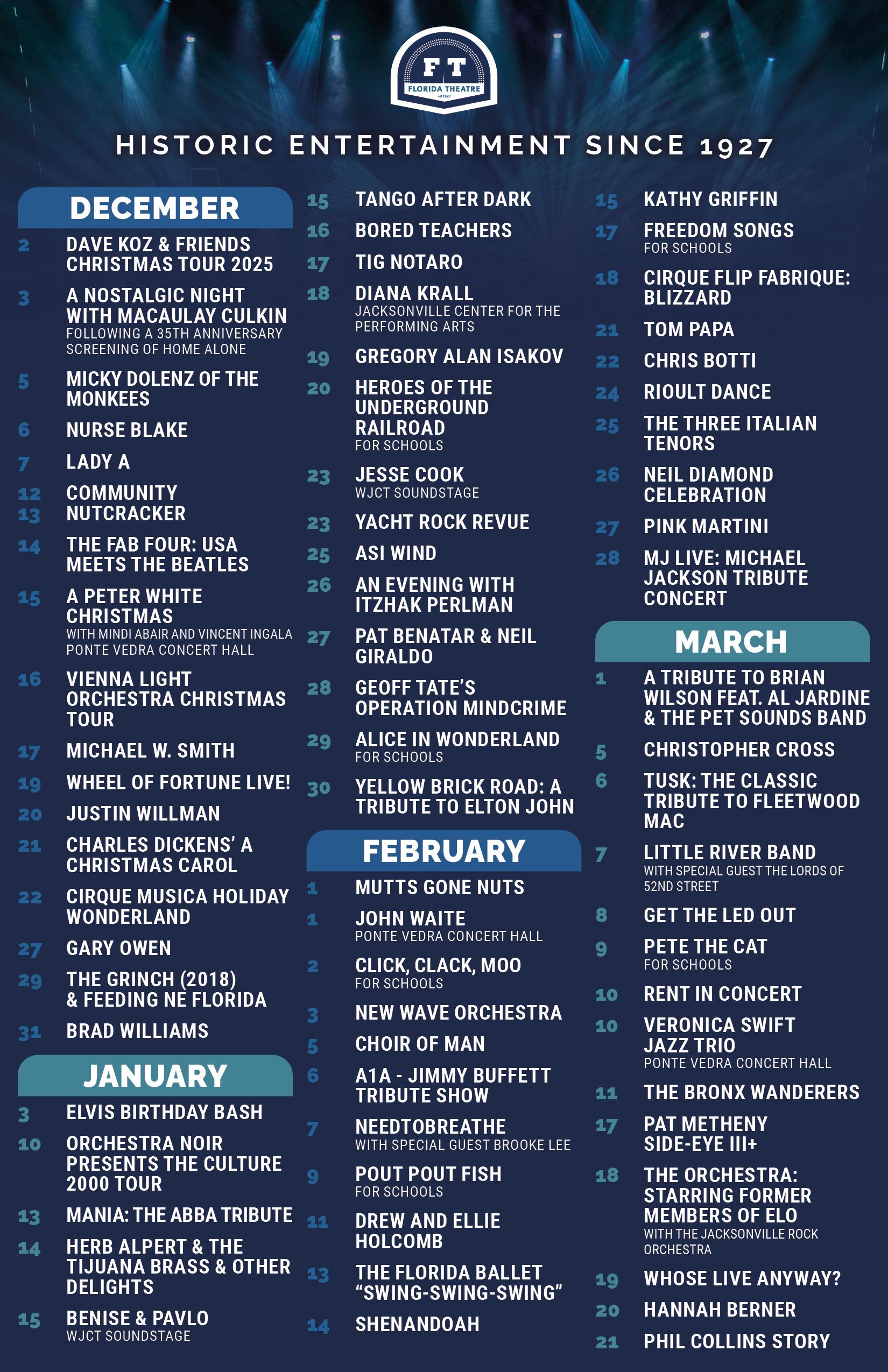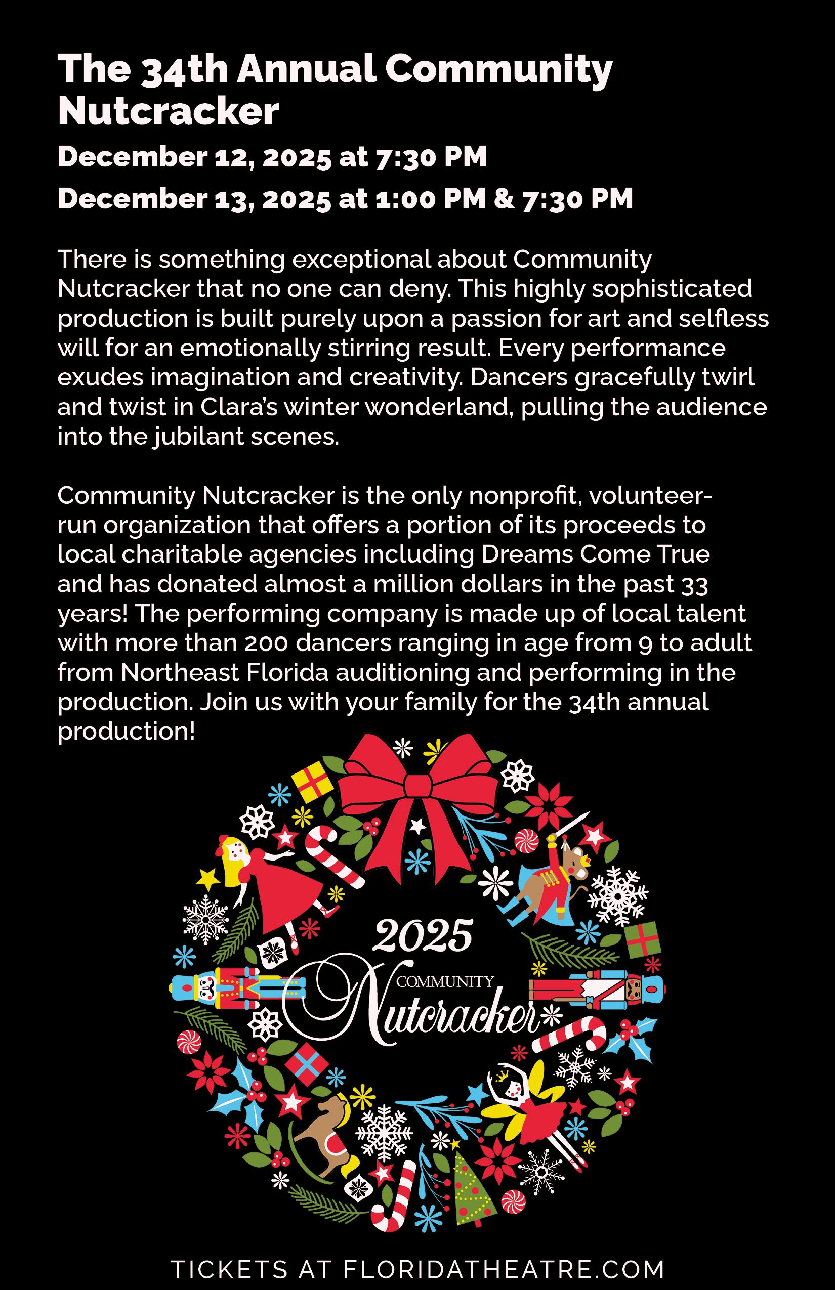 The Florida Theatre Performing Arts Center, Inc. is the nonprofit corporation that has managed and programmed the historic Florida Theatre in a public/private partnership with the City of Jacksonville, which owns the building, since 1987. The Theatre earns 85% of its annual budget from the sale of tickets and other business activities. Donations and sponsorships from these Individual and Business Members of the Florida Theatre, who made a gift between October 9, 2024 and October 9, 2025, helped to close the budget gap and preserve the Florida Theatre as the cultural anchor of downtown Jacksonville.