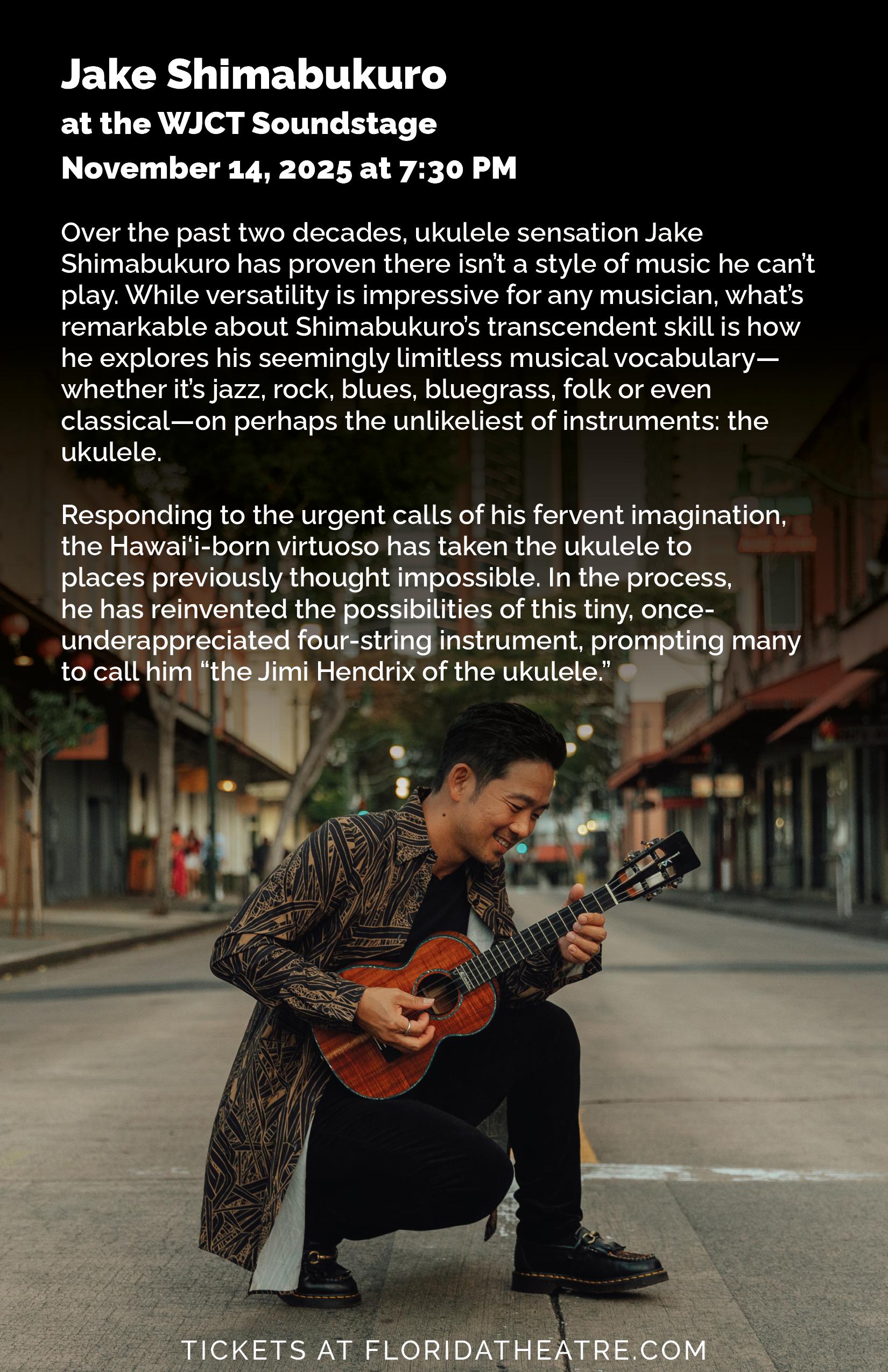 We’re working hard to make that happen this month. One night, we even have three shows happening simultaneously at Florida Theatre, WJCT Soundstage, Ponte Vedra Concert Hall.