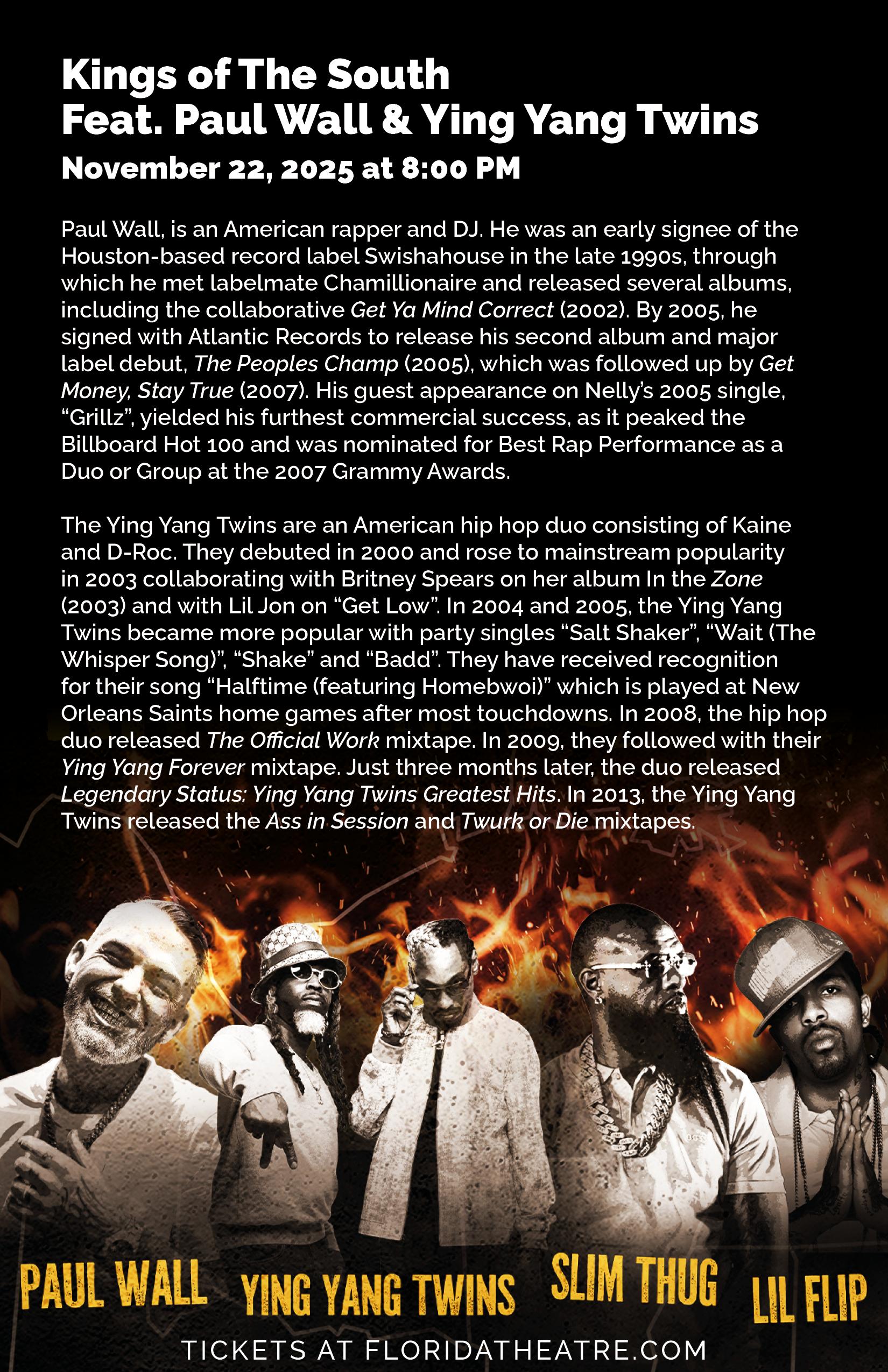 Add your name to the Florida Theatre’s email and mailing lists at the Ticket Office, by calling 904.355.5661 or at floridatheatre.com. Name, address, phone and email is required of all ticket purchasers in case of a problem with your order, or in case a show is cancelled or postponed. Ticket buyers are automatically entered on the Theatre’s mail and email lists, and will receive information about upcoming performances. An opt-out option is offered, but all information is confidential. The Florida Theatre does not sell, rent, trade or otherwise allow other entities access to its mailing lists.